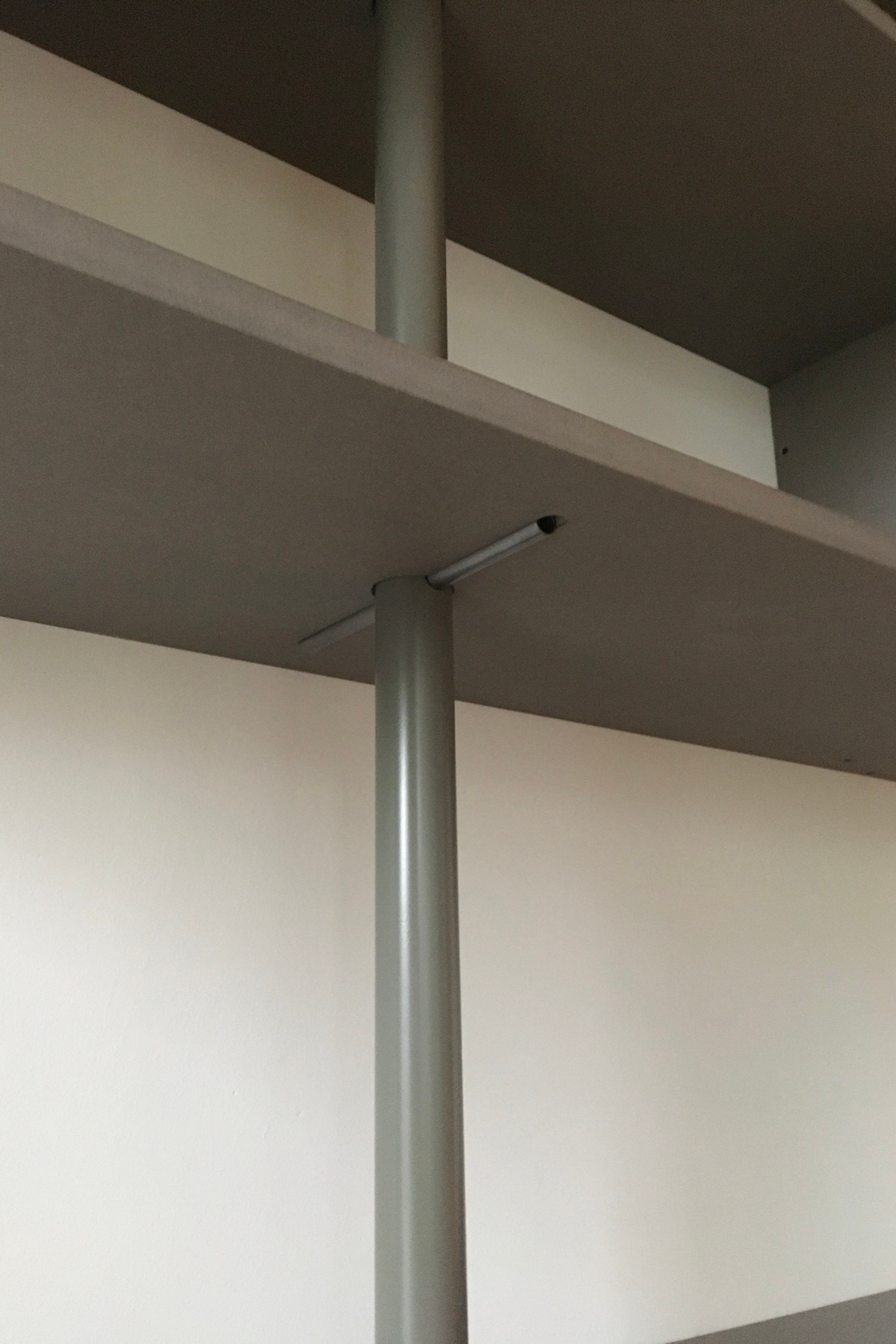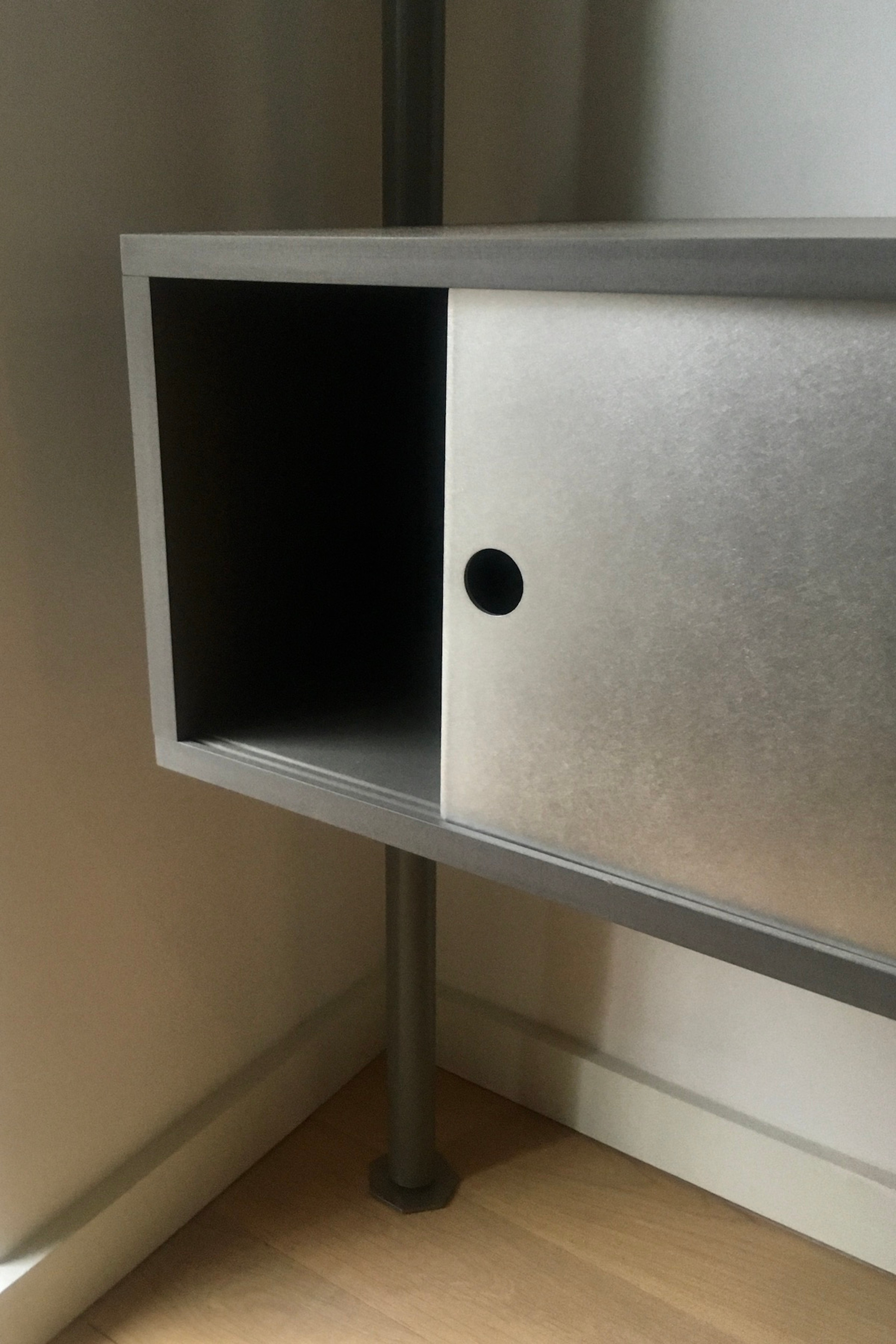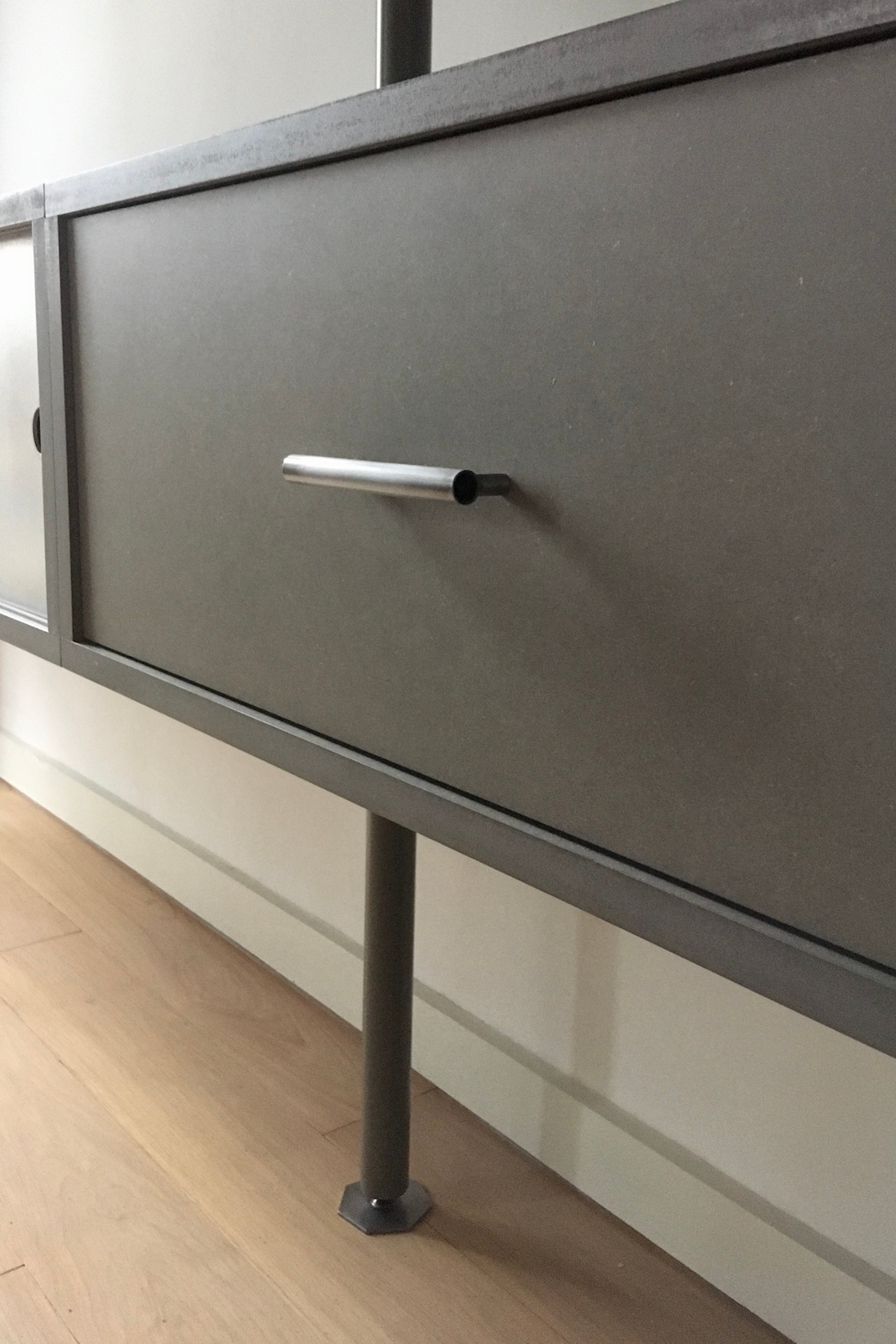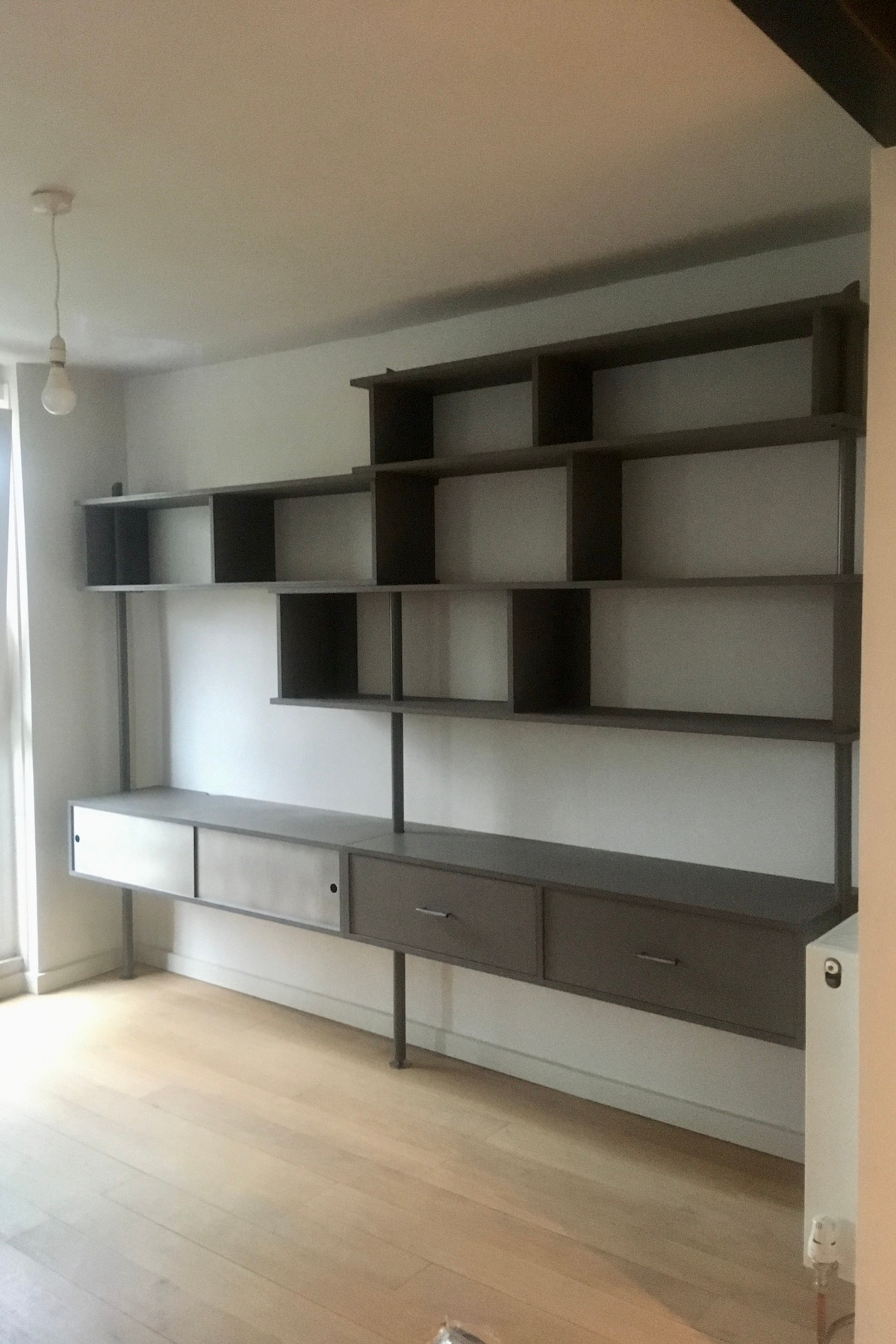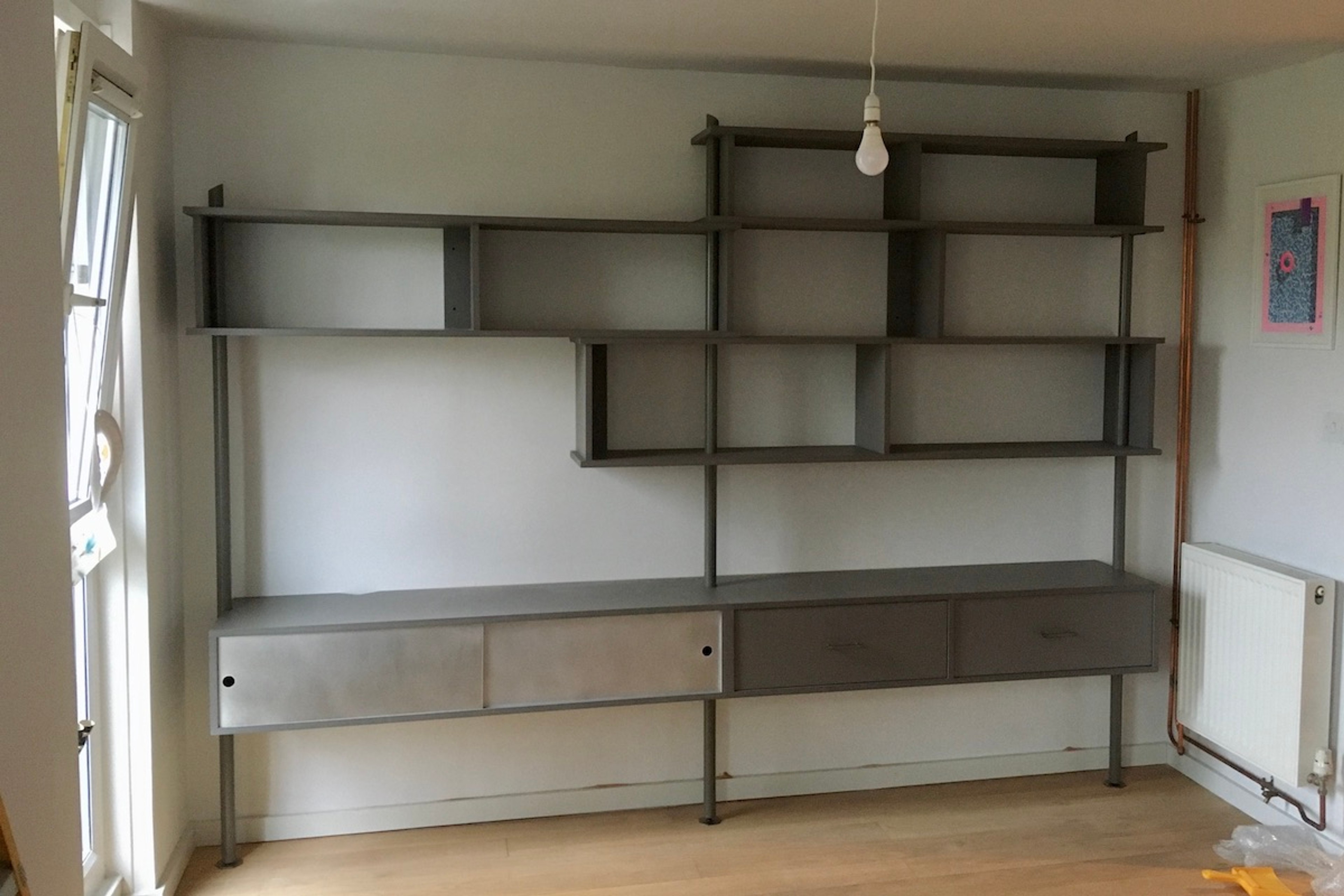 An expansive wall unit incorporating shelving, drawers and a cupboard with sliding doors. The shelves are skewered by three legs resting onto pegs which in turn pierce horizontally through the legs. The structure allows for easy construction of the flat parts in situ.