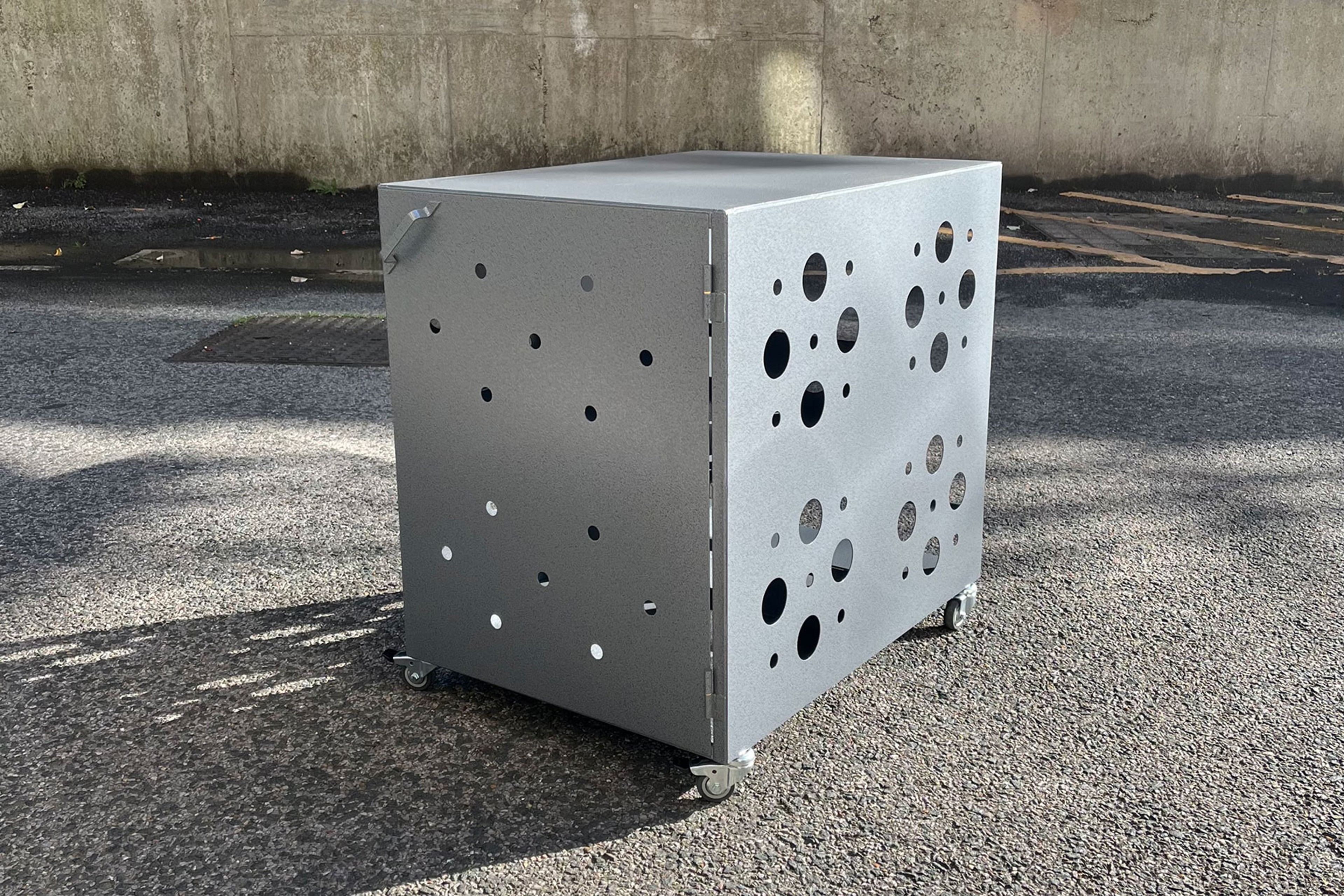 Equipment trolley with hinged door and open back. The perforations allow for easy cable routing.