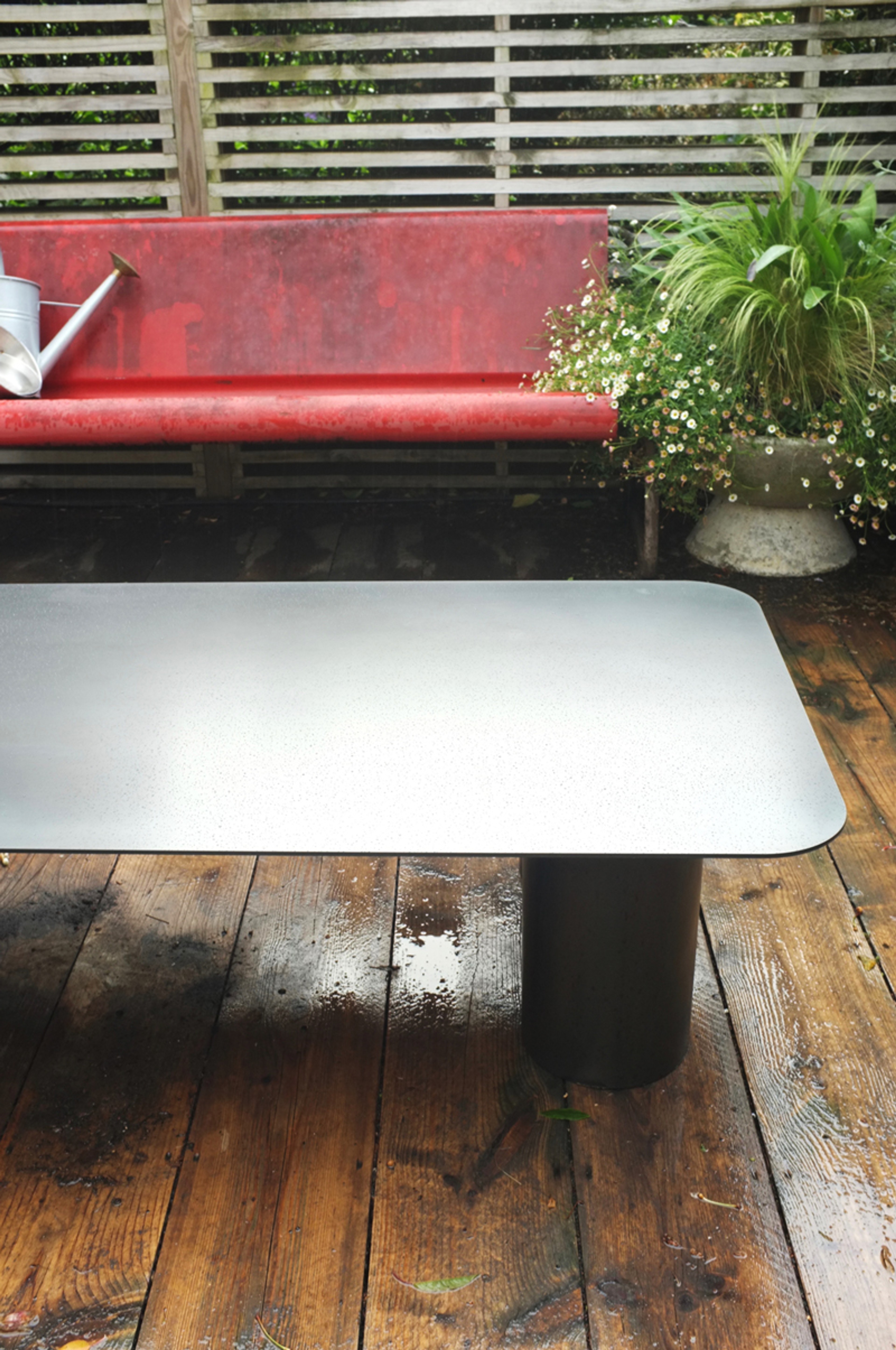 An all steel outdoor Table/come Bench. The table breaks down easily into three parts, a 6mm mild steel top is held in place under its on weight on top of a two part leg structure.
