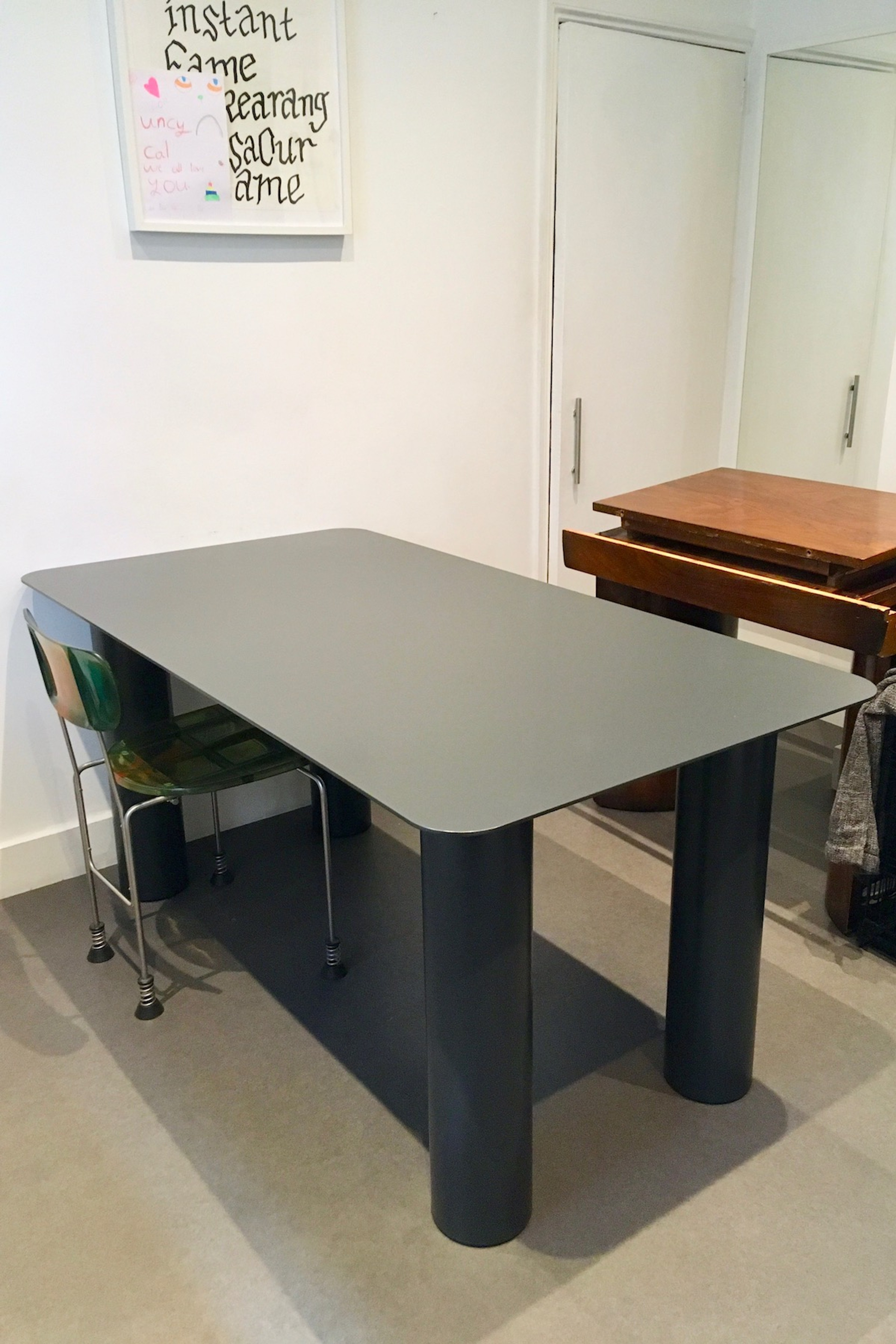 All Steel dining table a variation on “HEAVY” table. The table breaks down into parts to allow easier handling/moving.