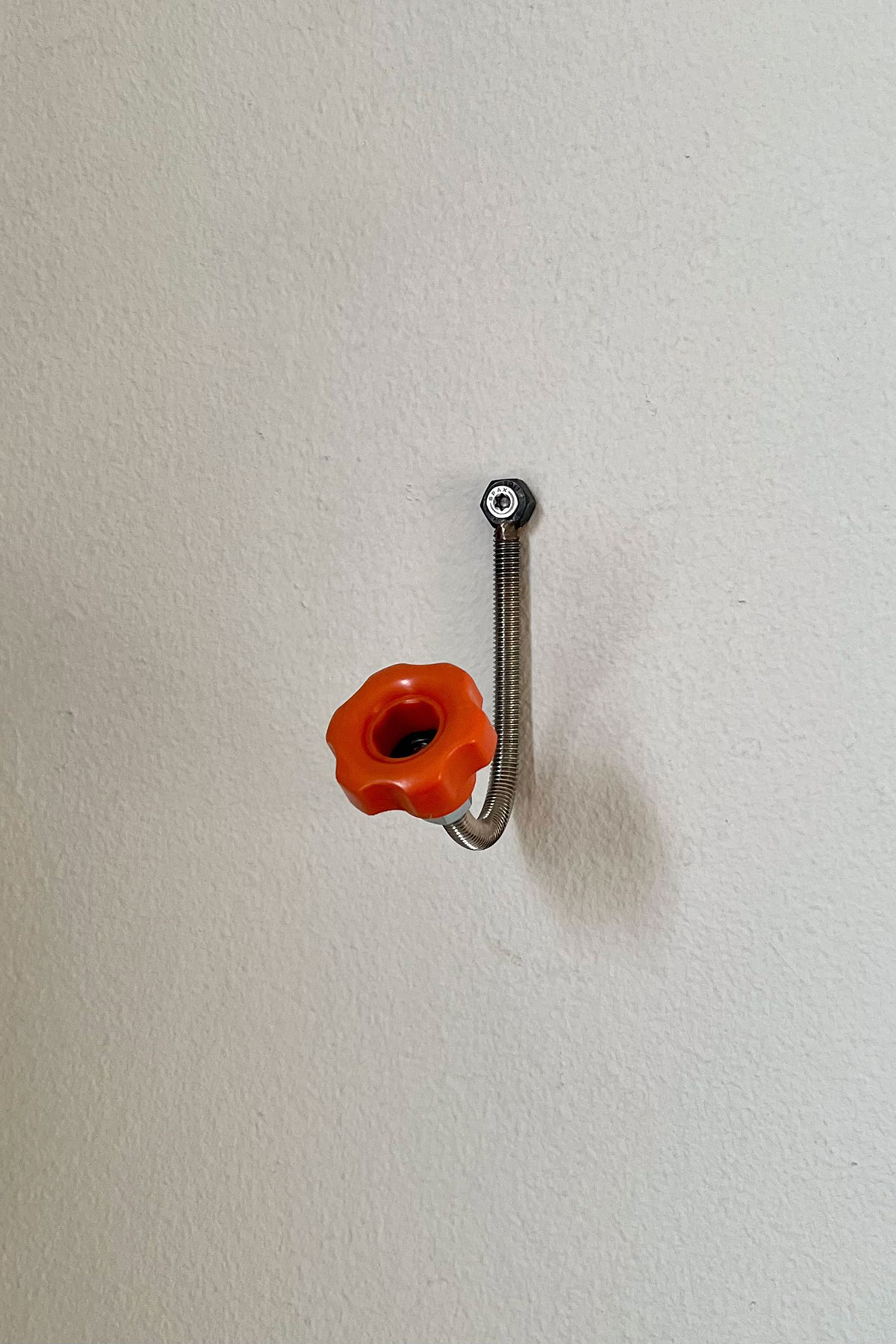 Hook using a piece of threaded bar, nuts and a knob from an old DeWalt radial arm saw.