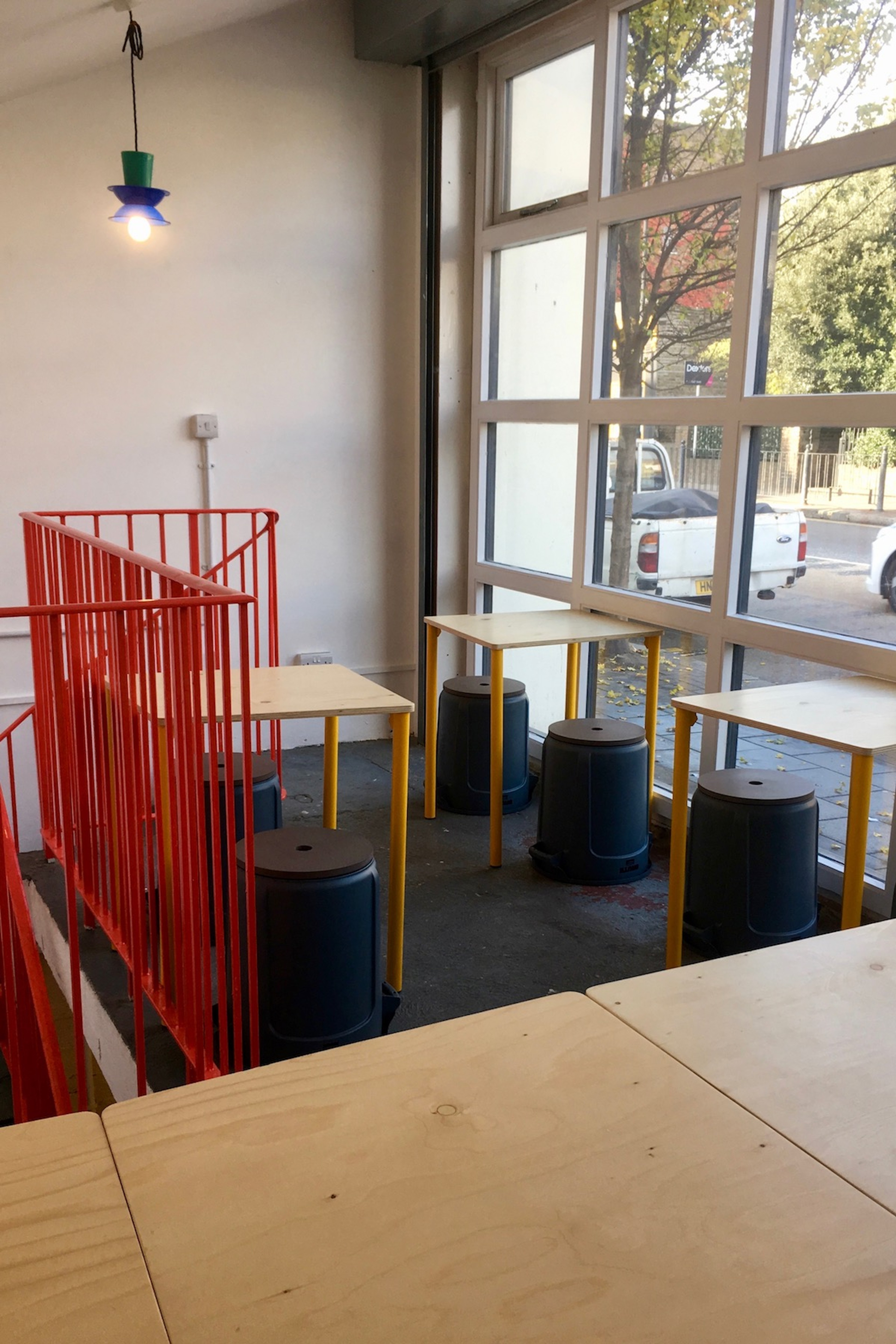 Furniture/interior design for Lanark Coffee‘s new space J.Bell. The space which is next door to the original Lanark will provide extra seating and a rotating display/retail wall. All furniture was designed to use ready made items and hardware where possible, re-purposing catering supplies and readily available materials. With the tables this idea of repurposing was not possible so we opted to go with a design with minimal waste and labour involved. The irregular tops are cut from a single sheet of ply that is divided into a grid of 10 and 5 degree angles this uses the board entirely producing no waste. The shapes are intended to be easy to slip past in the tight space while also allowing interesting configurations for large groups if needed. The legs are a repeat of the same design utilising a laser cut bracket and tubular upright, there is no need for further supporting structure which means the tables can also stack in to towers of three.