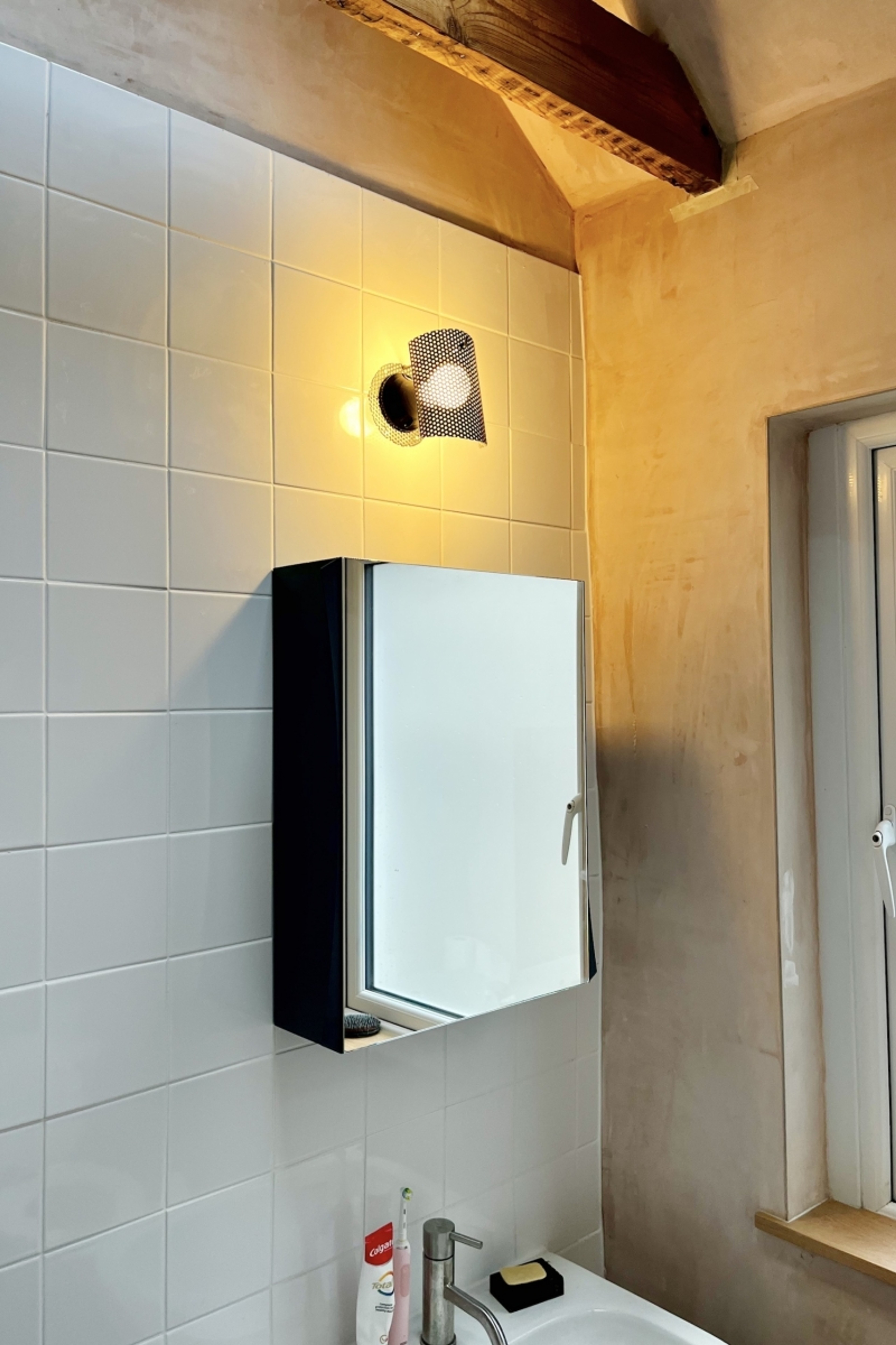 Metal medicine cabinet with mirrored door and accompanying wall lamp.