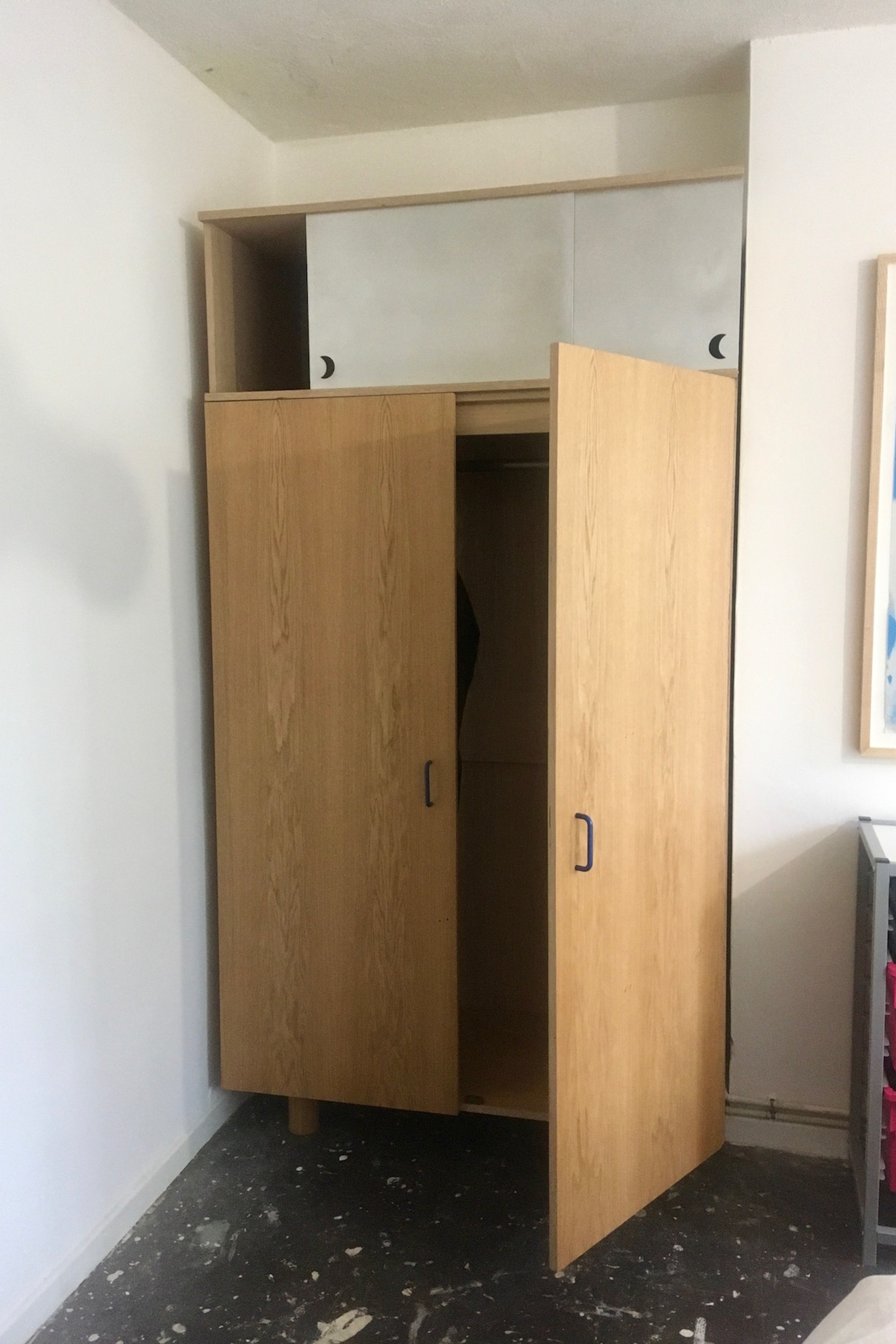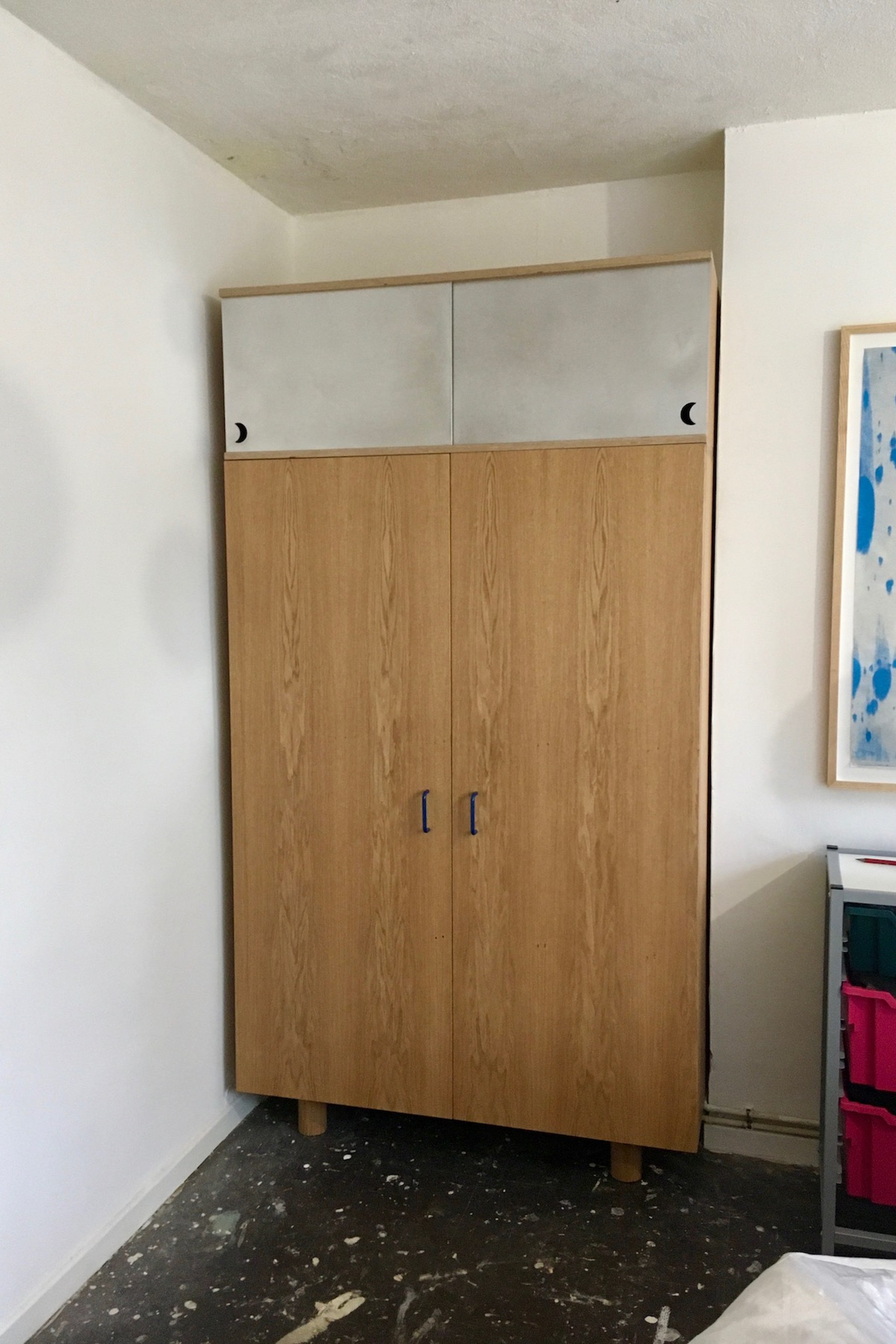 Wardrobe based on the Moon sideboard. Main cupboard with hinged doors and rail, top unit with sliding aluminium doors.