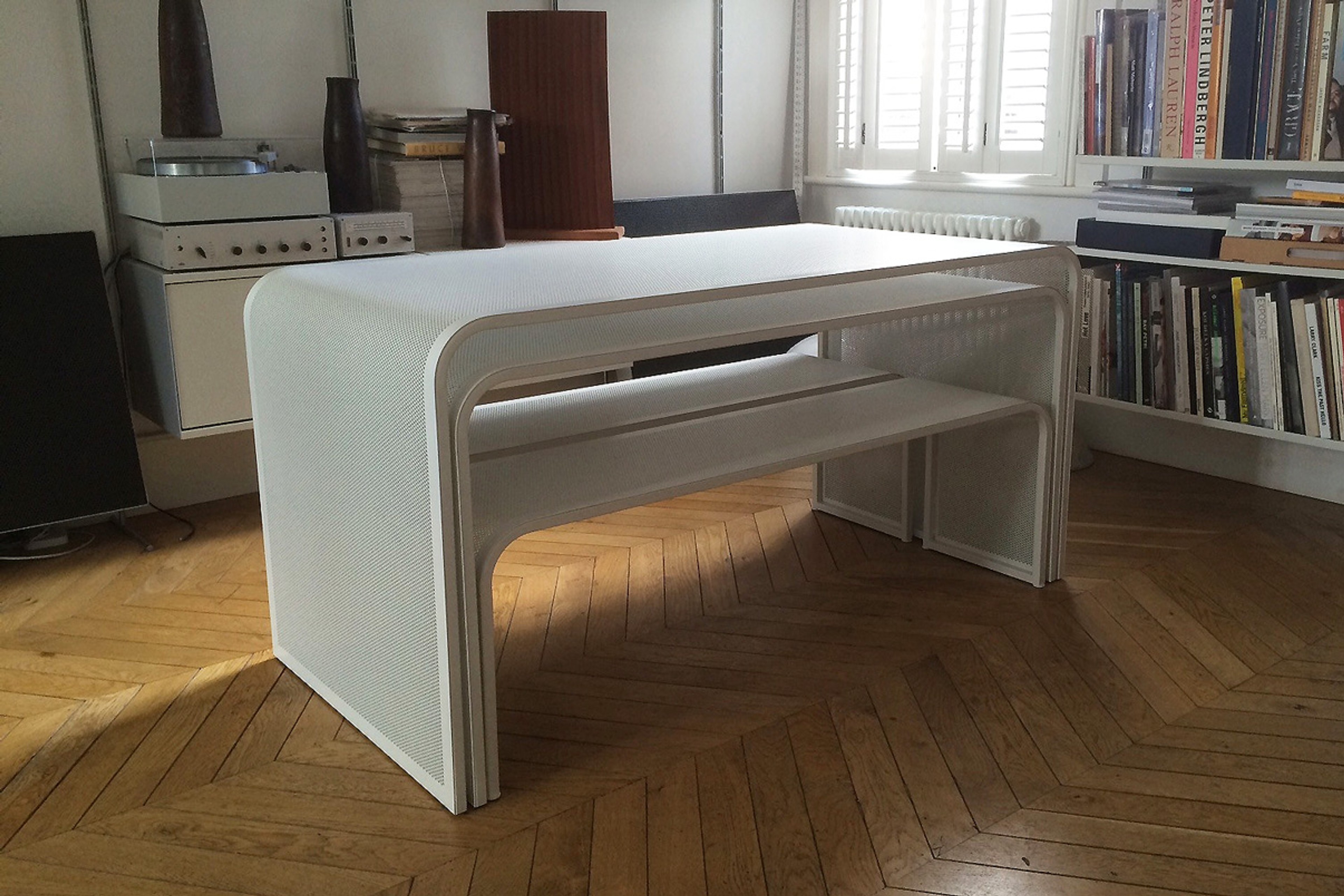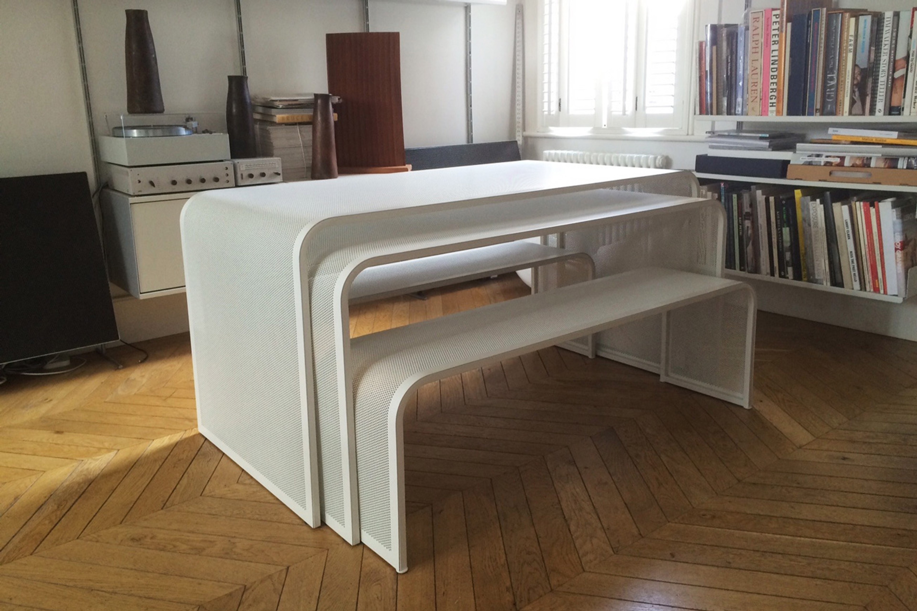 A nesting dining set, two tables with benches. Designed to accompany and compliment an extensive Vitsoe/Rams collection.