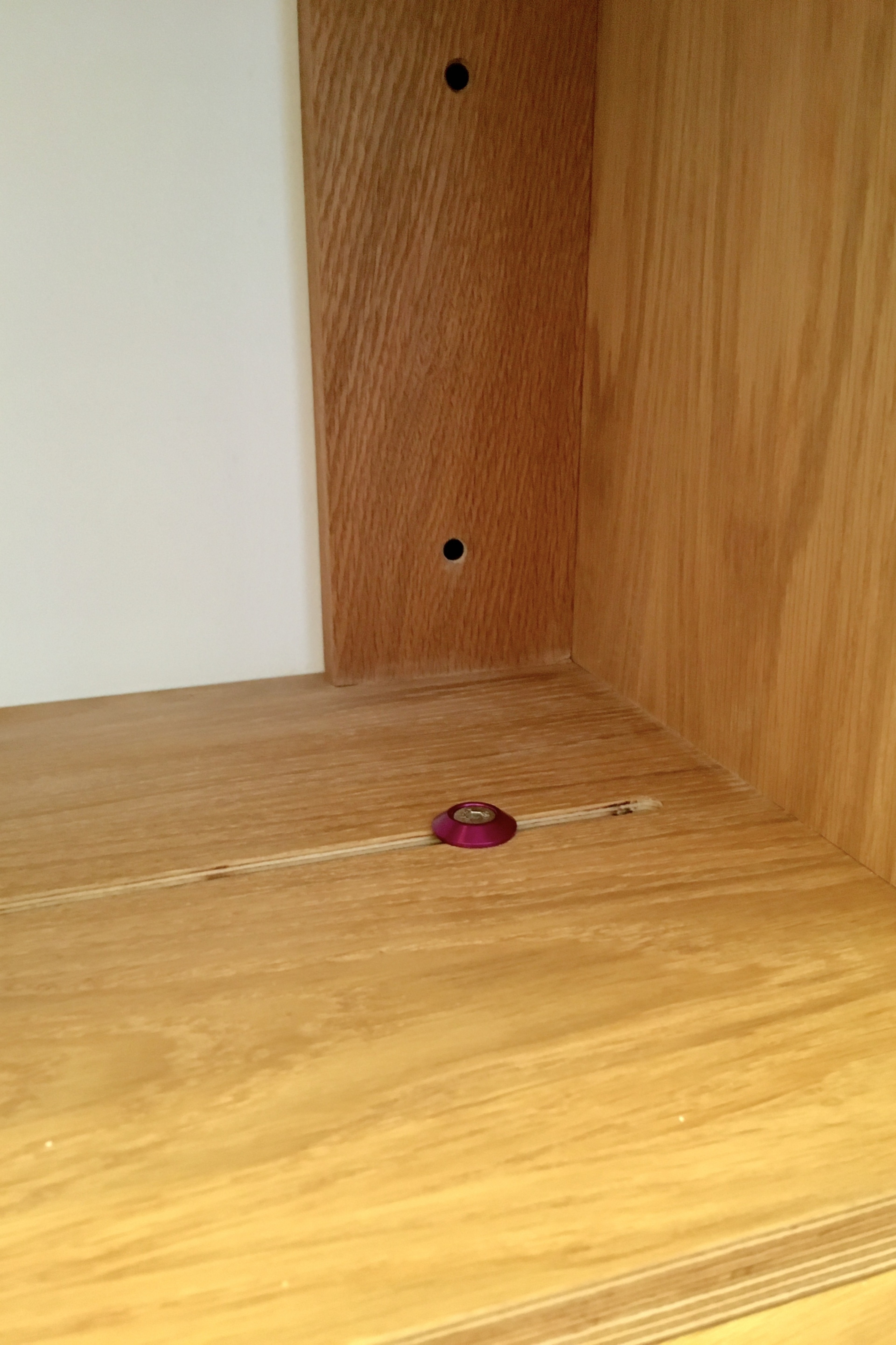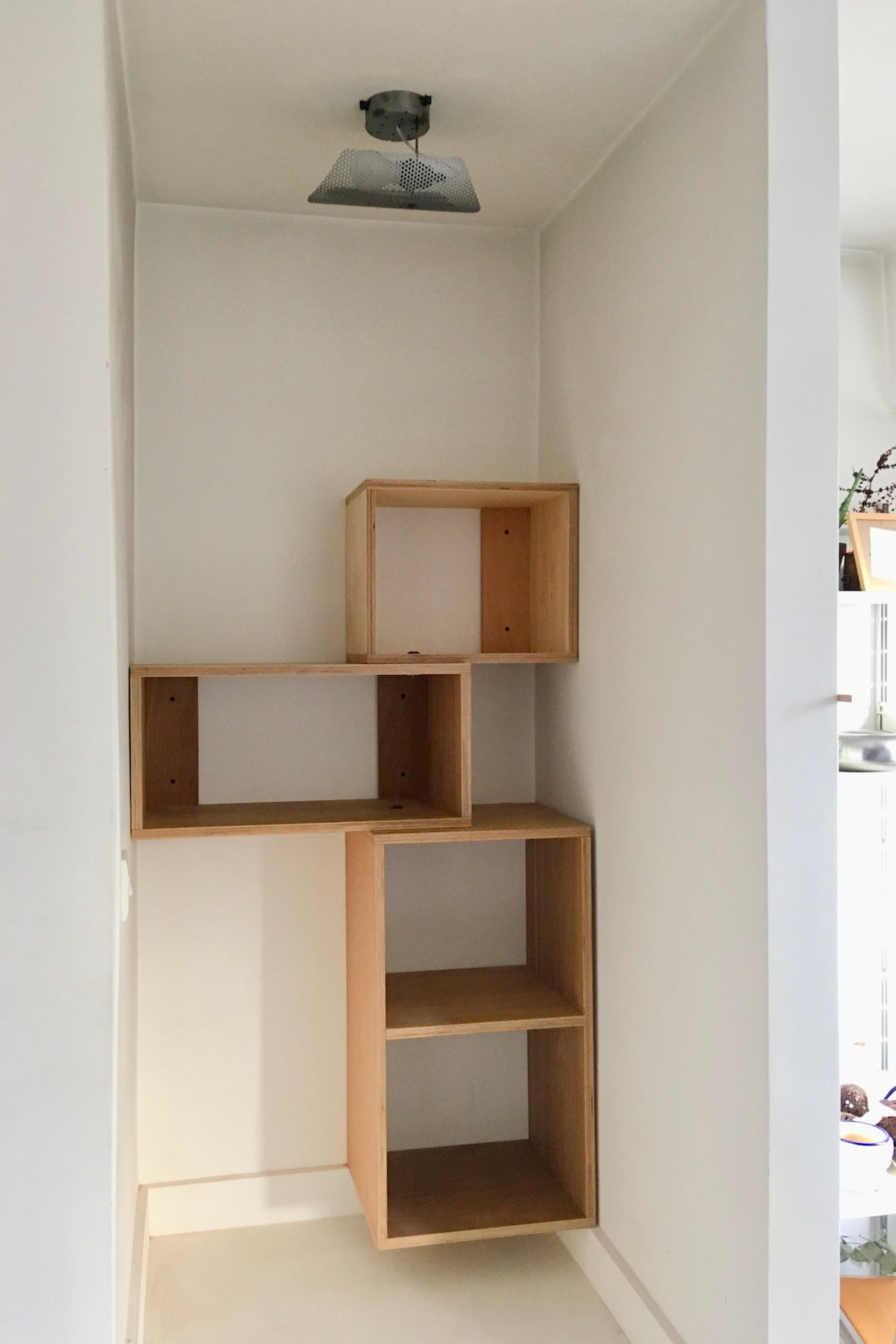 Shelves and lamp to fit within an awkward alcove. The shelves bolt to each other through routed slots allowing for re-configuration in future spaces.