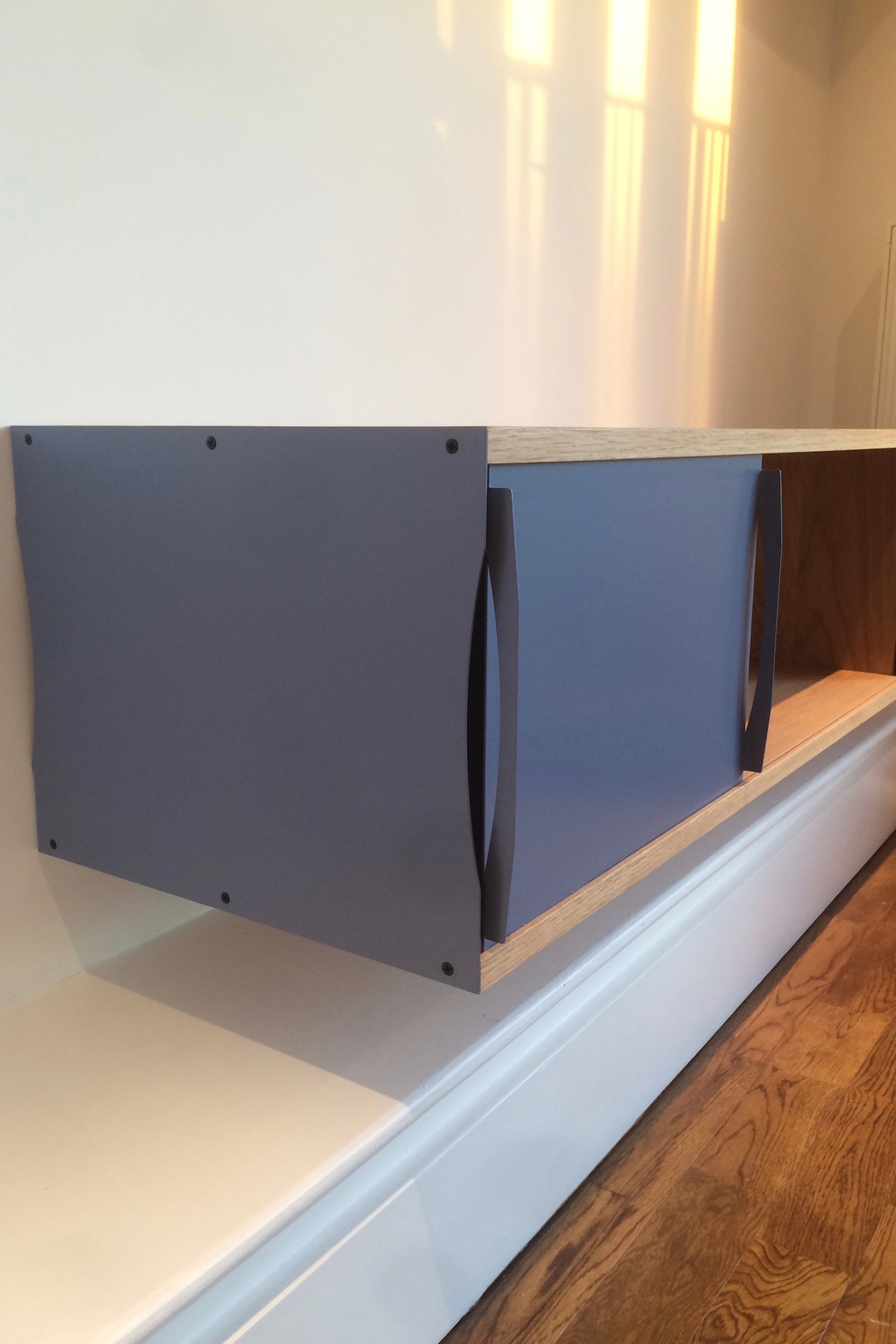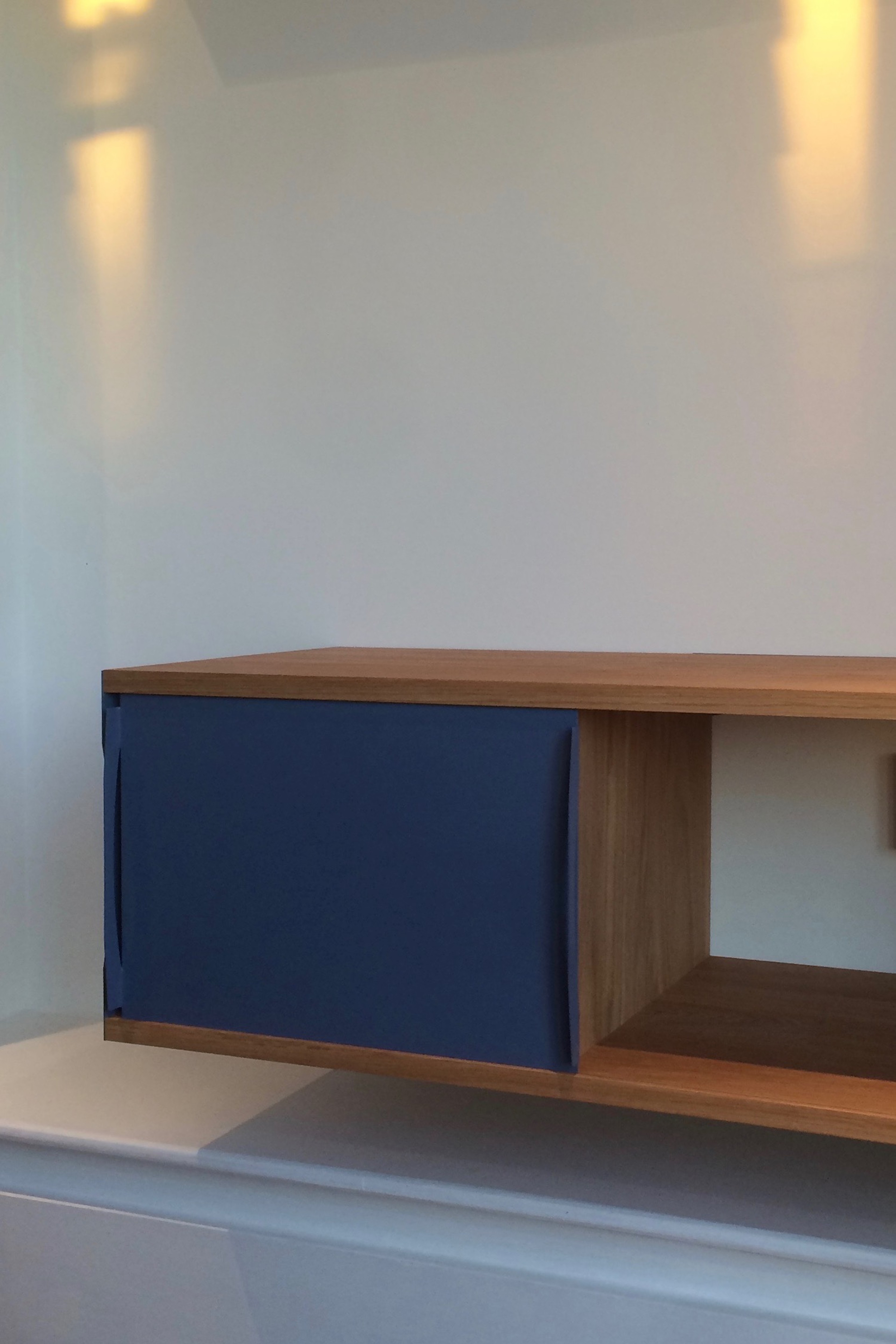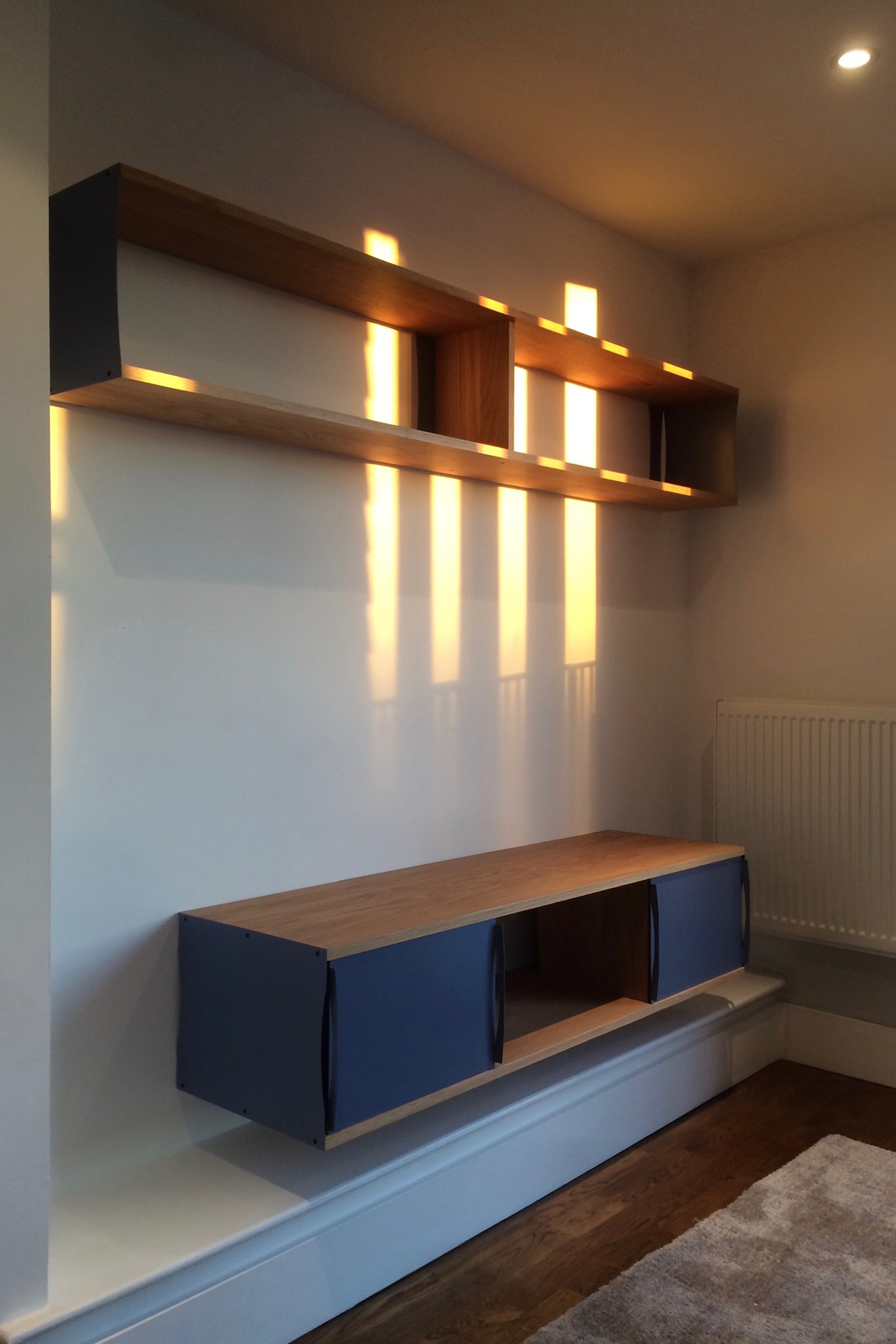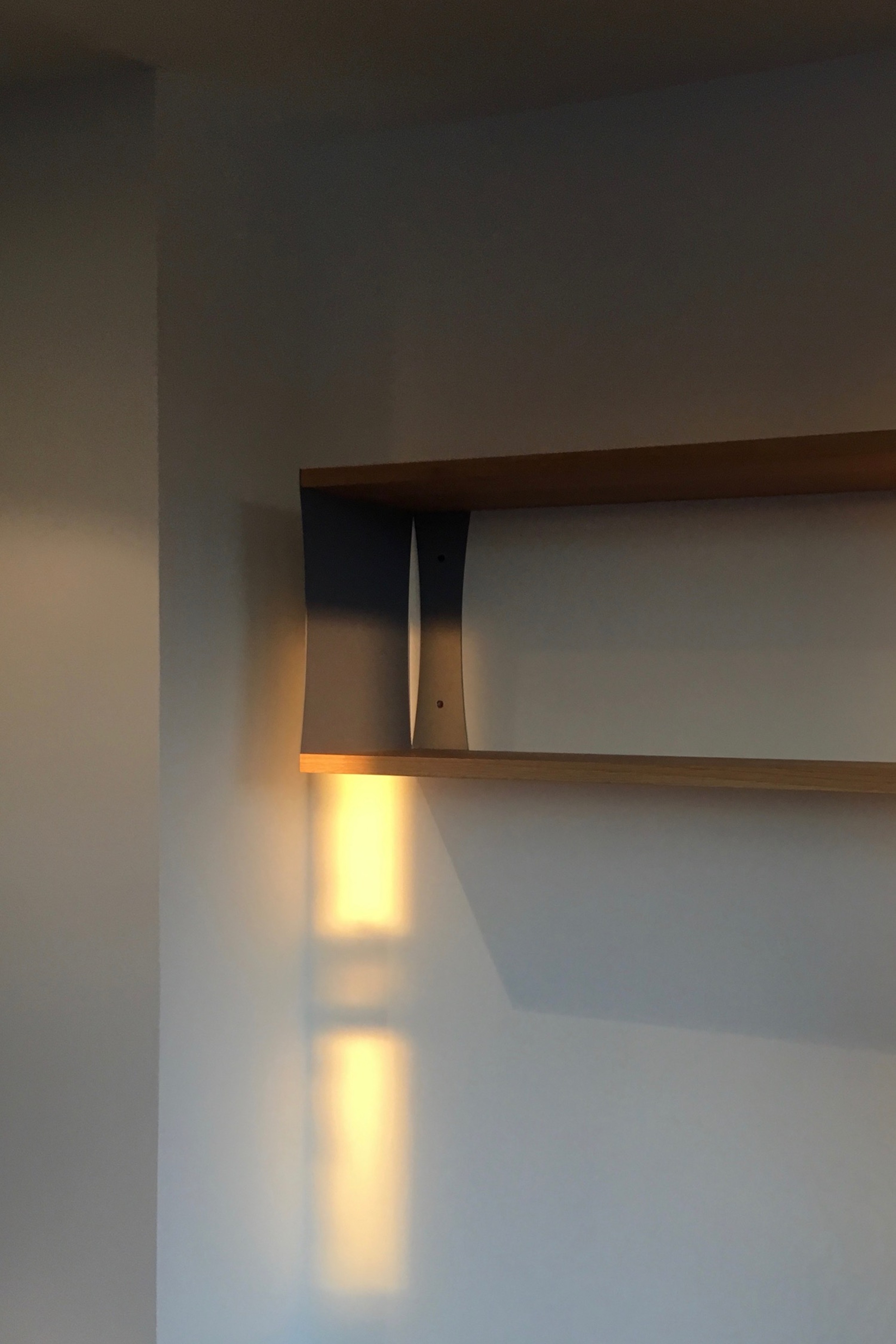 Wall mounted tv and shelving unit. Oak boards are joined and supported by laser cut brackets. The brackets use a variation of the same arc cutout throughout which aids folding and also allows for easier cable routing.