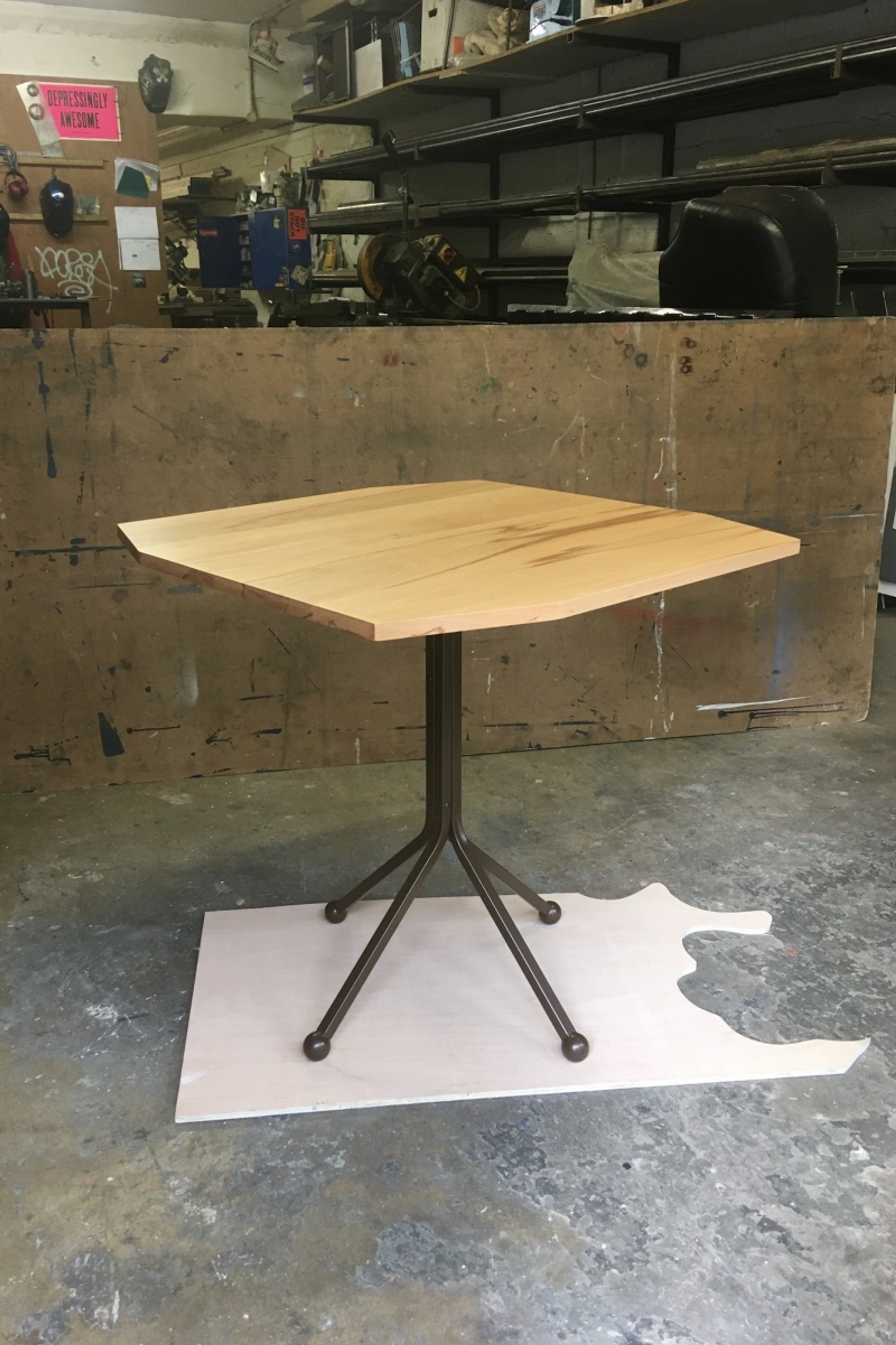 An updated version of an earlier table which flat packs. This time with a solid Beech top and steel ball feet.