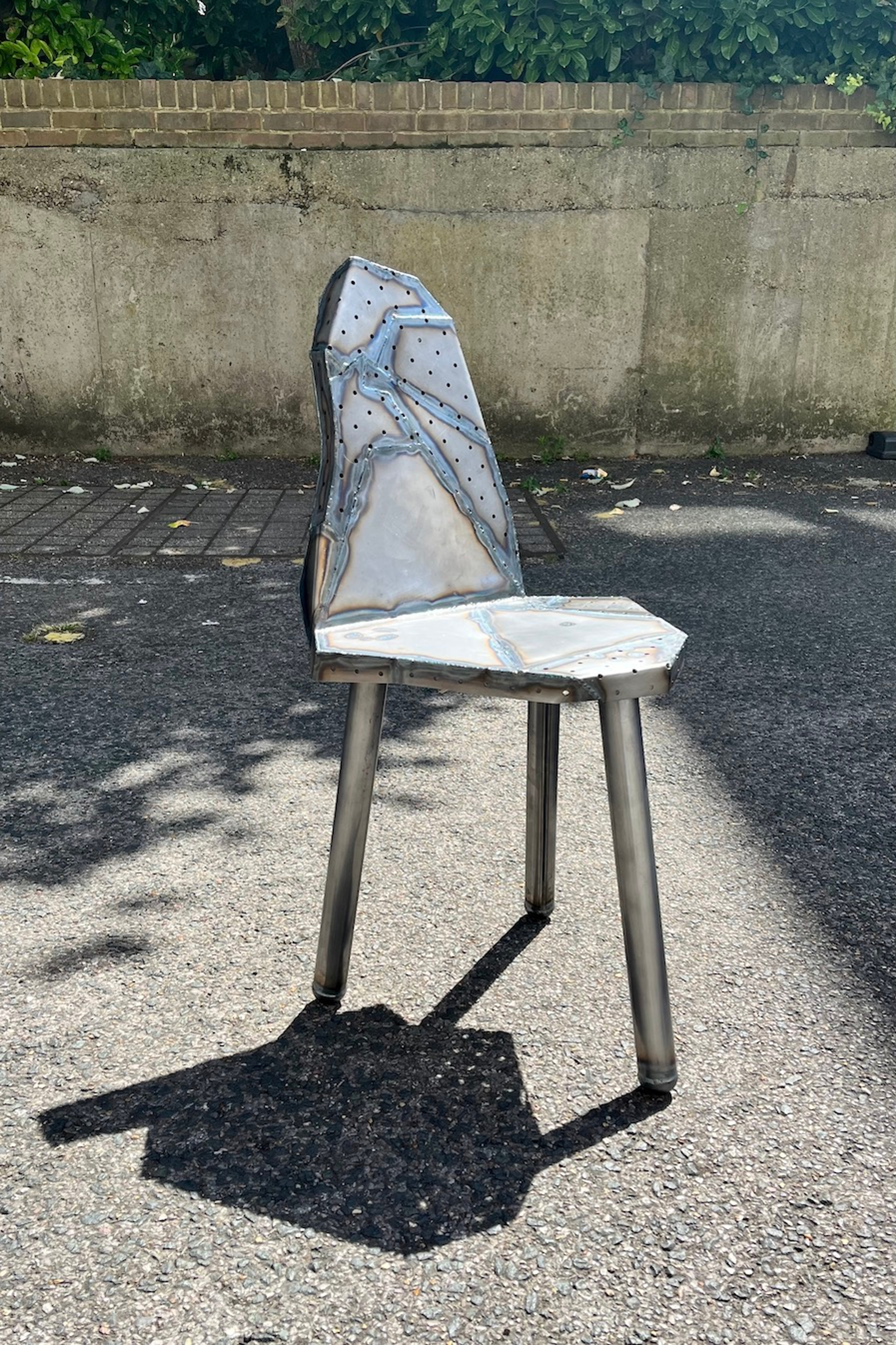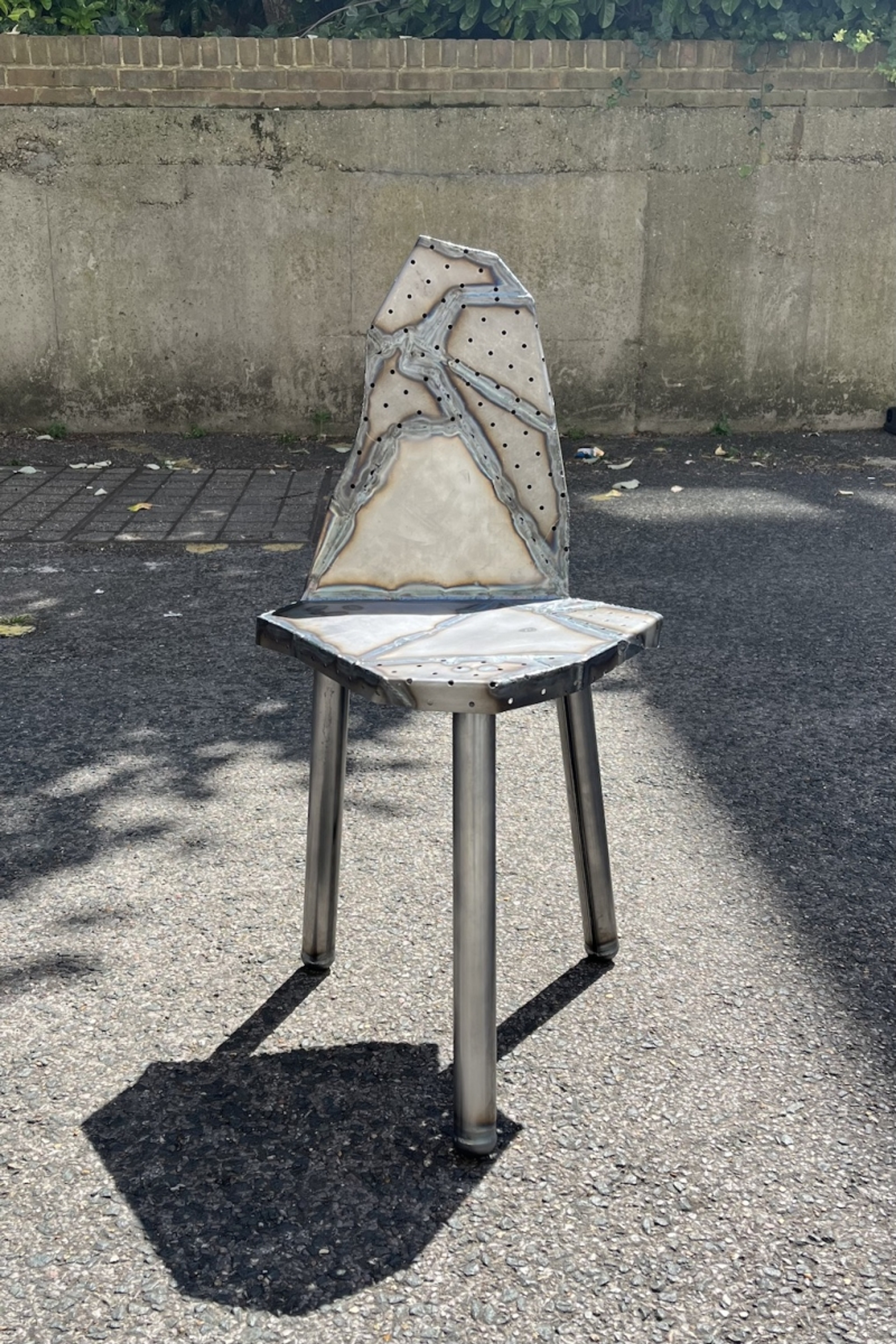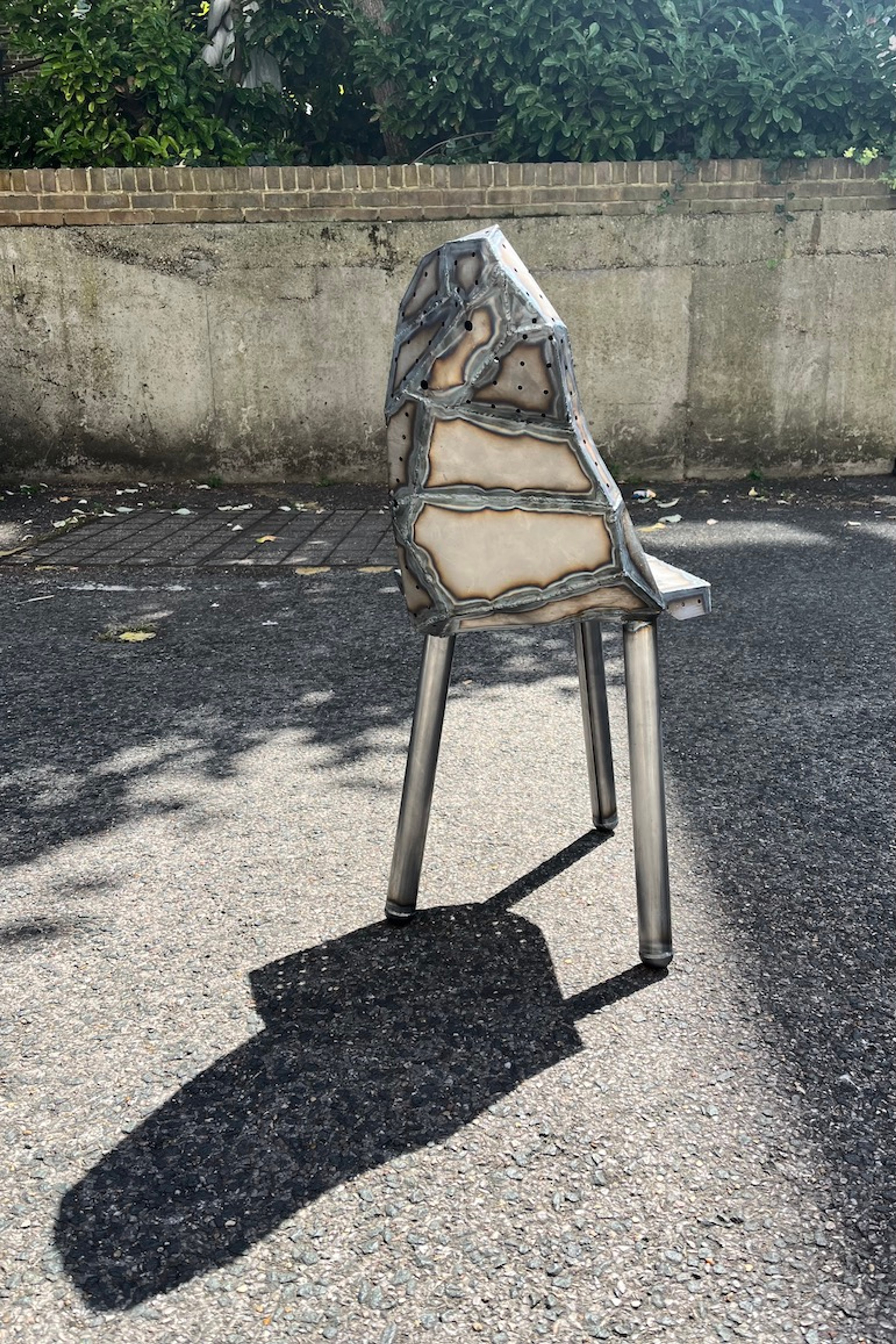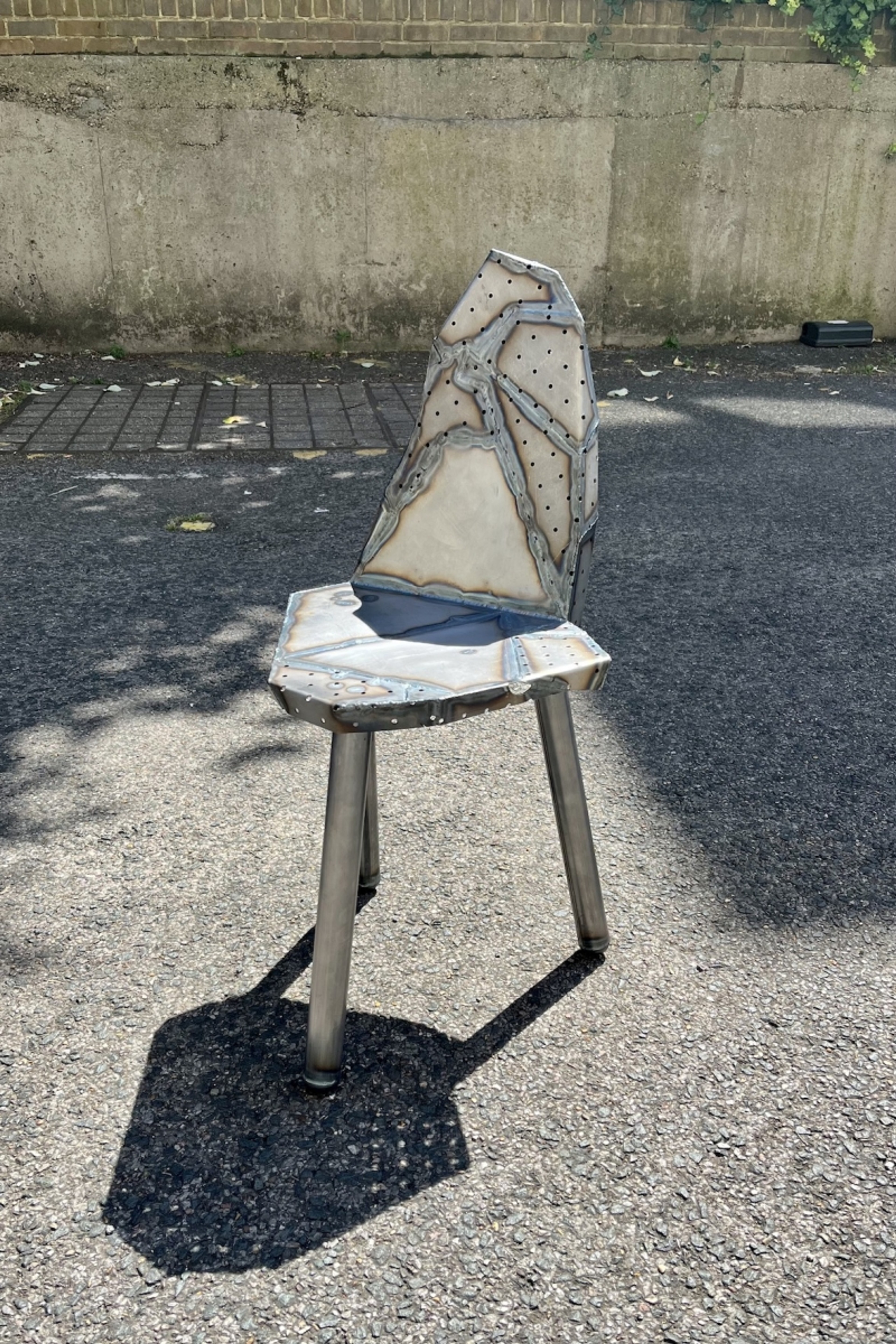 Chair made with a patchwork of steel sheet offcuts. As much as possible the pieces were kept as found with their shape dictating the form of the chair.