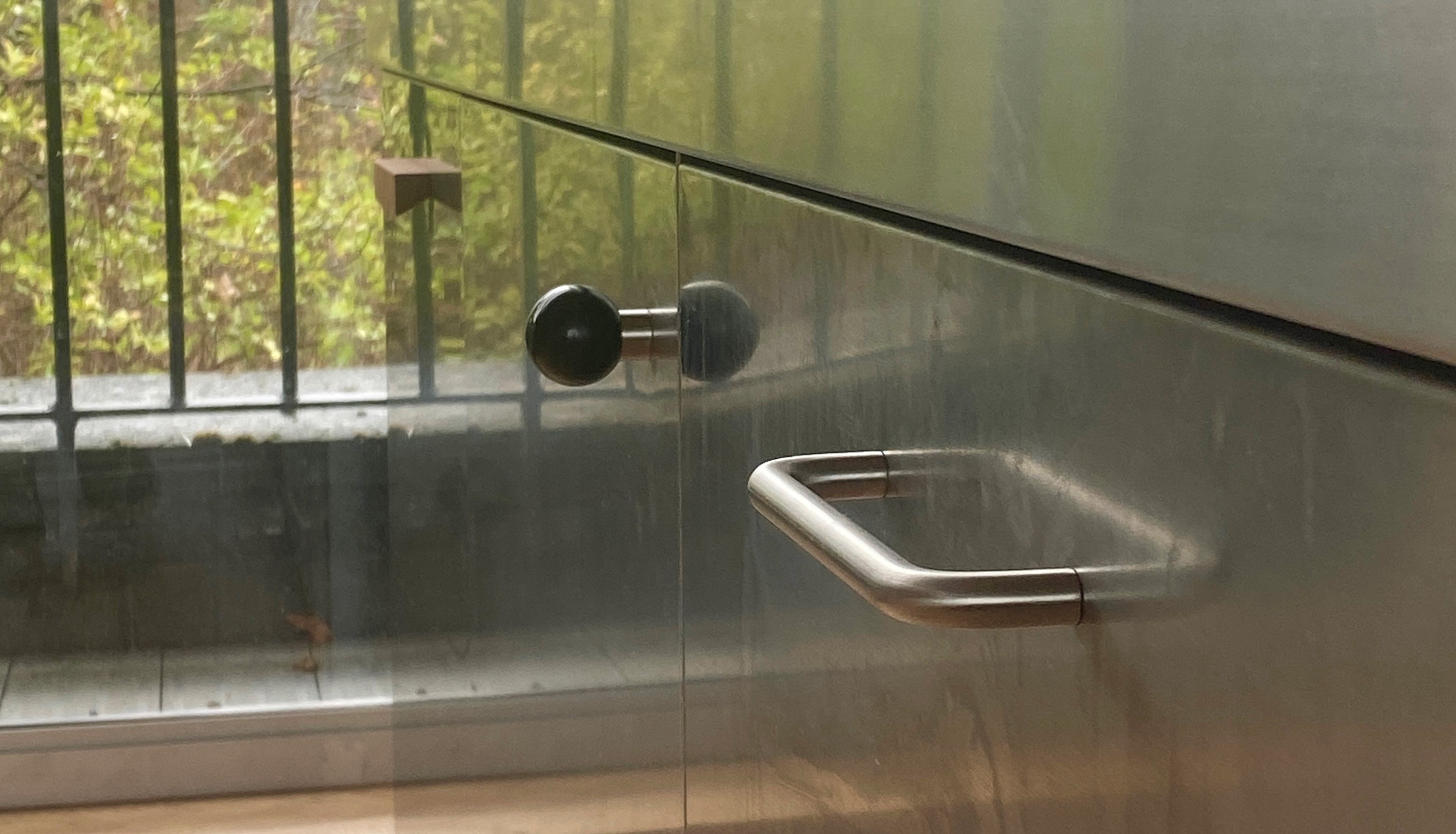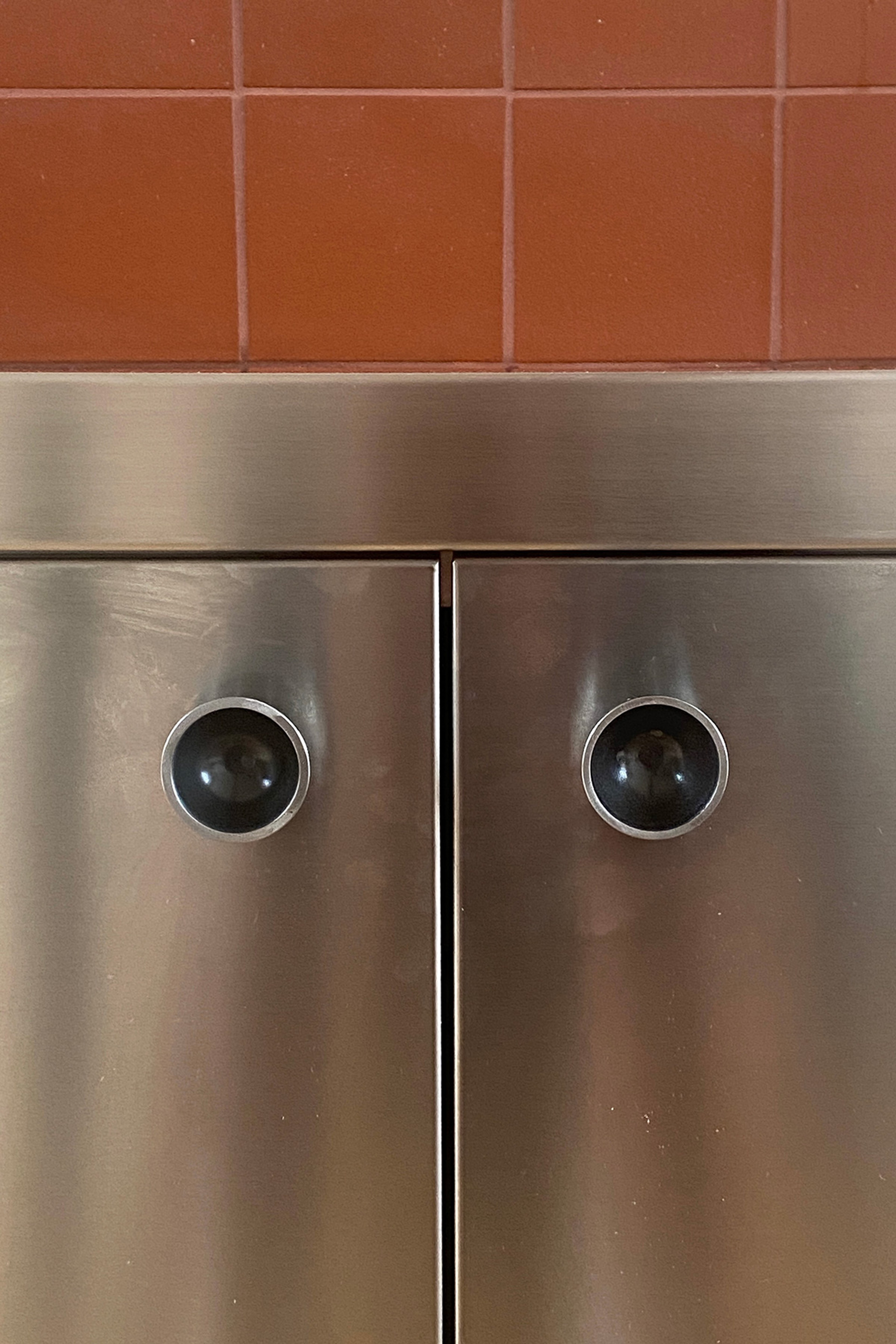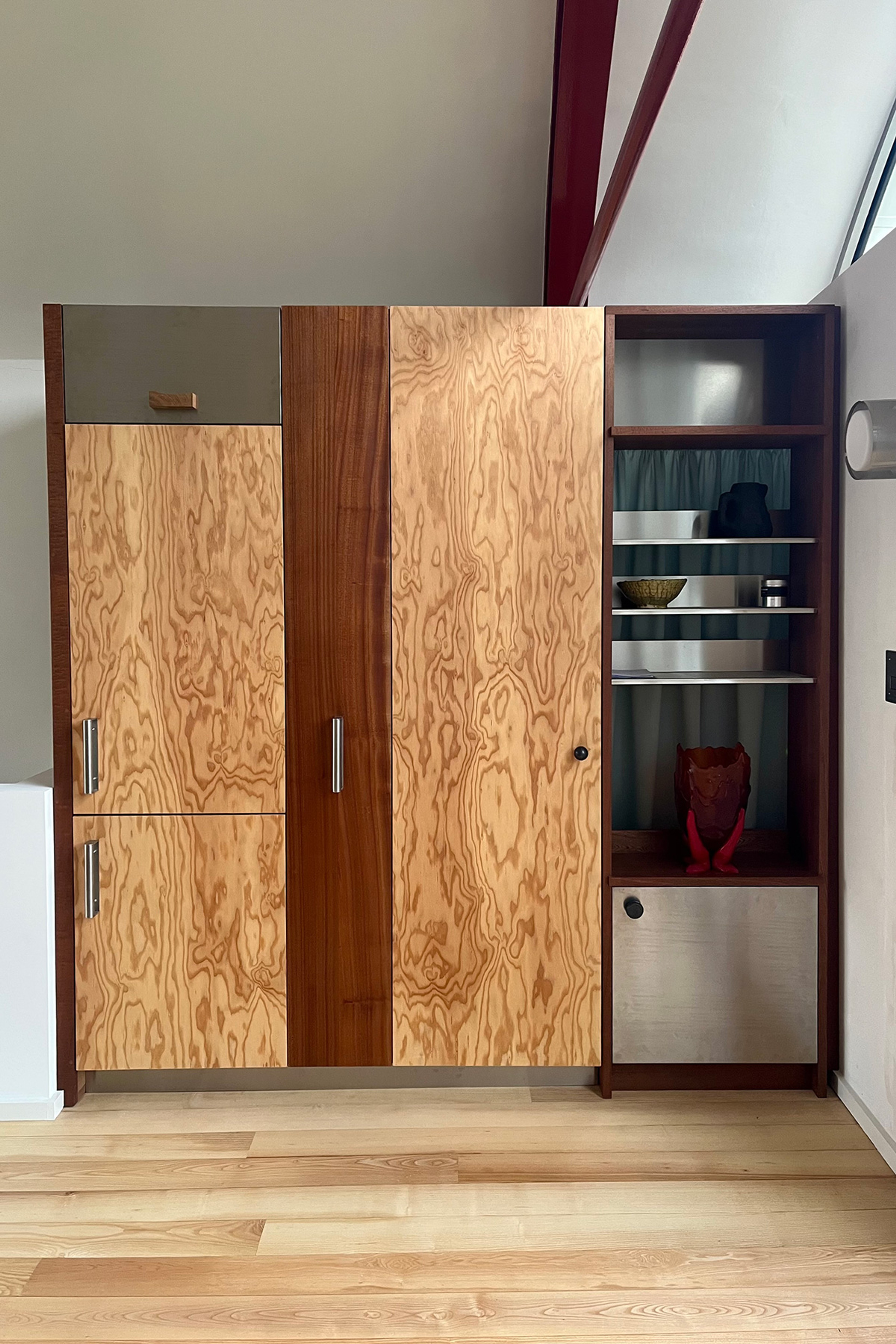 Kitchen encompassing a large boiler surround, galley kitchen, wall units and lighting. The boiler surround holds a fridge freezer, pull out pantry and cupboards with removable storage at the right to allow boiler maintenance. The boiler itself is screened with a fabric curtain in front of which are removable shelves and cupboard, for full access the shelves and cupboard can be easily removed allowing you to step inside. The main kitchen a timber unit with pull out drinks trolley at the centre flanked by stainless steel units either side, above this cabinets with integrated lighting.