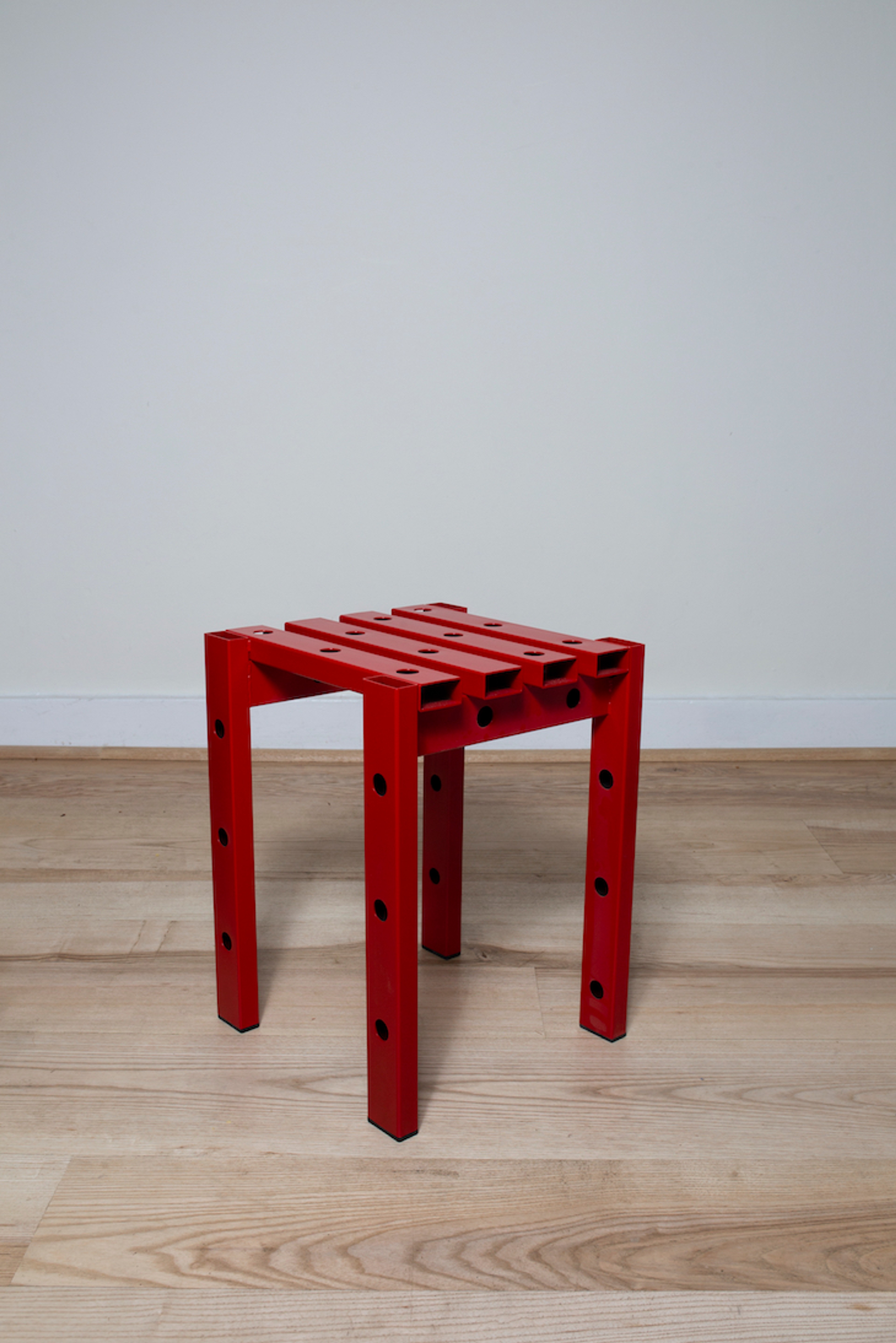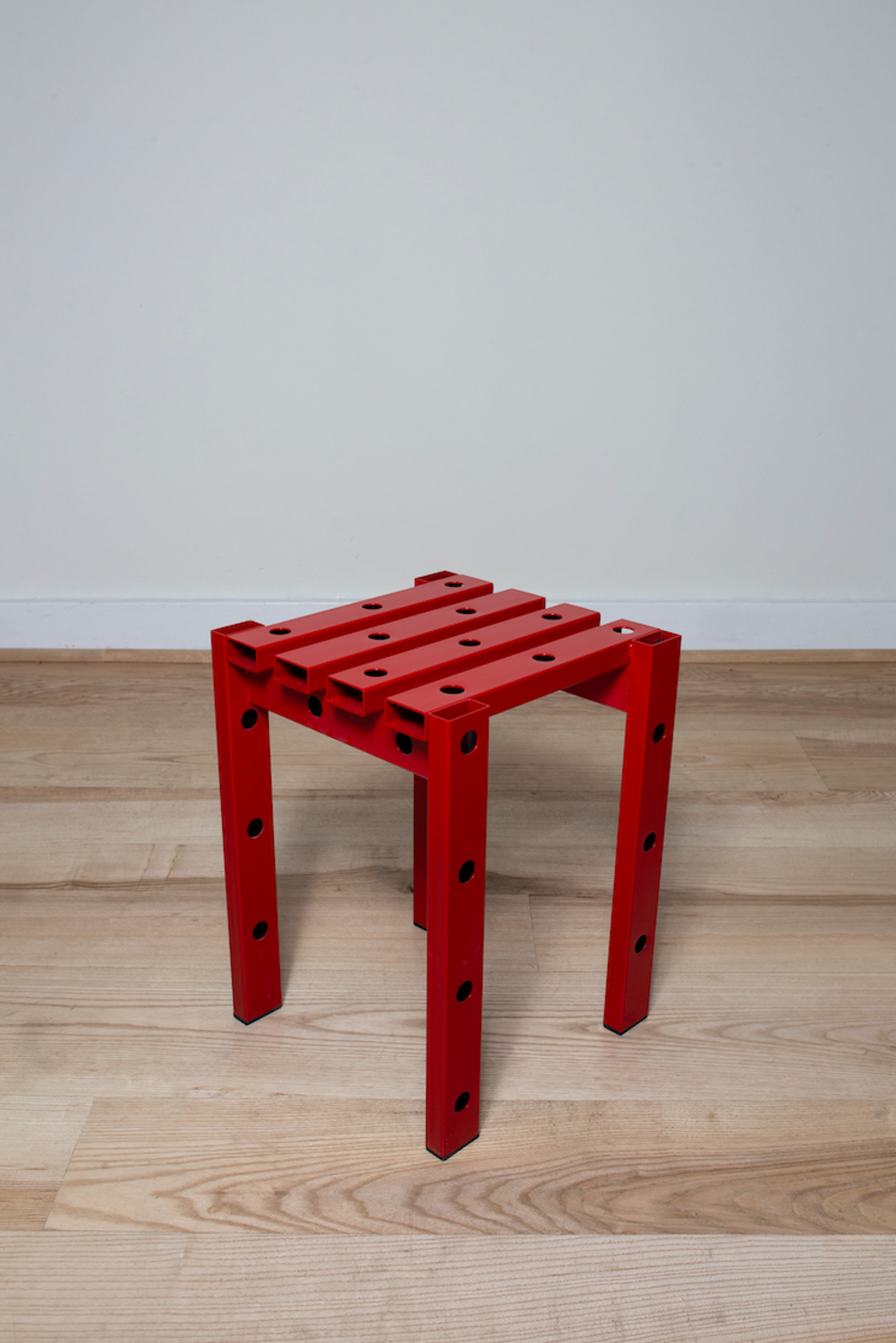 Stool using punched box section. Part of a series of one-off/improvised chairs for Redemption Roasters.