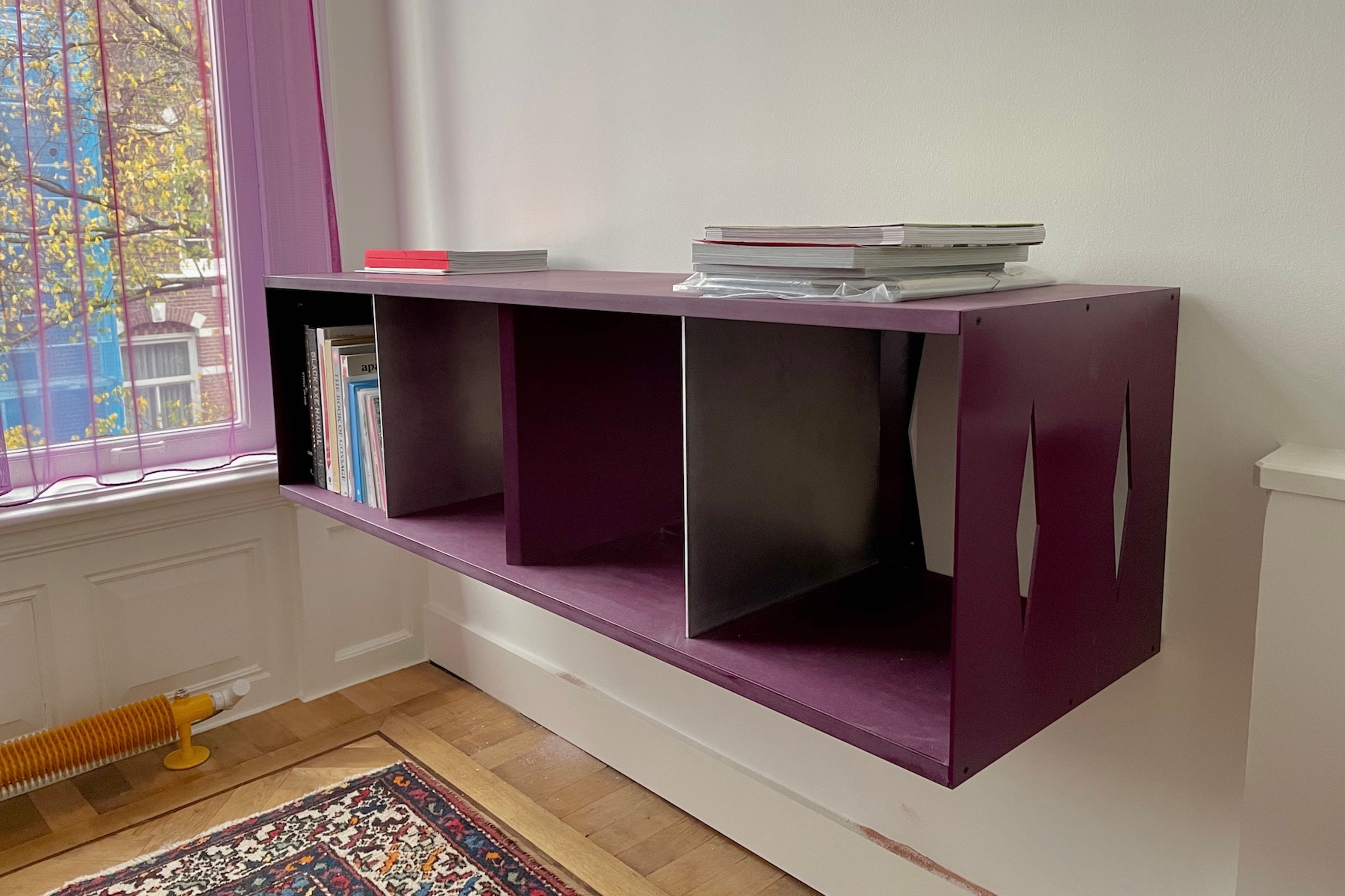 Wall unit designed to store records. A continuation of Grey but this time Purple.