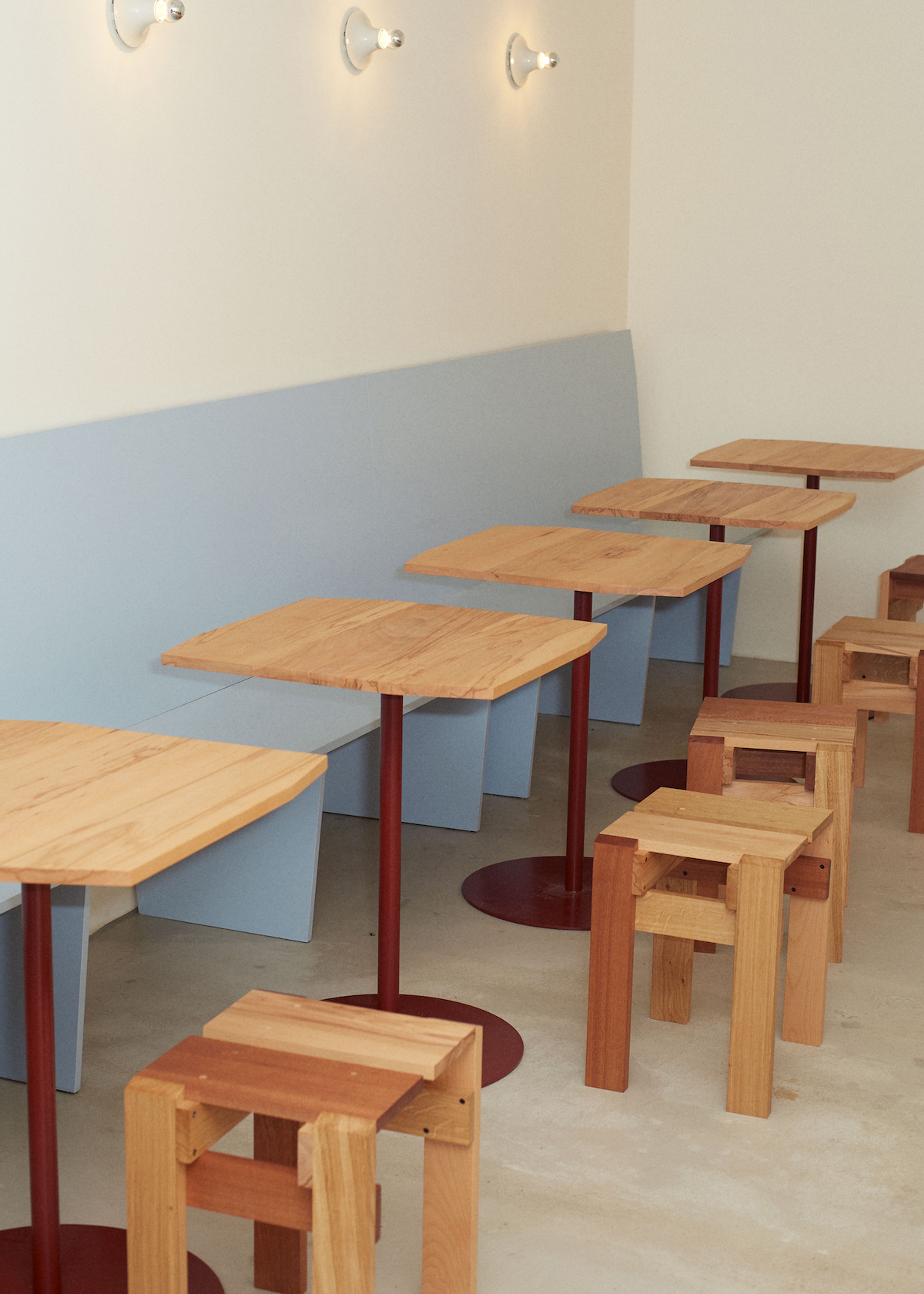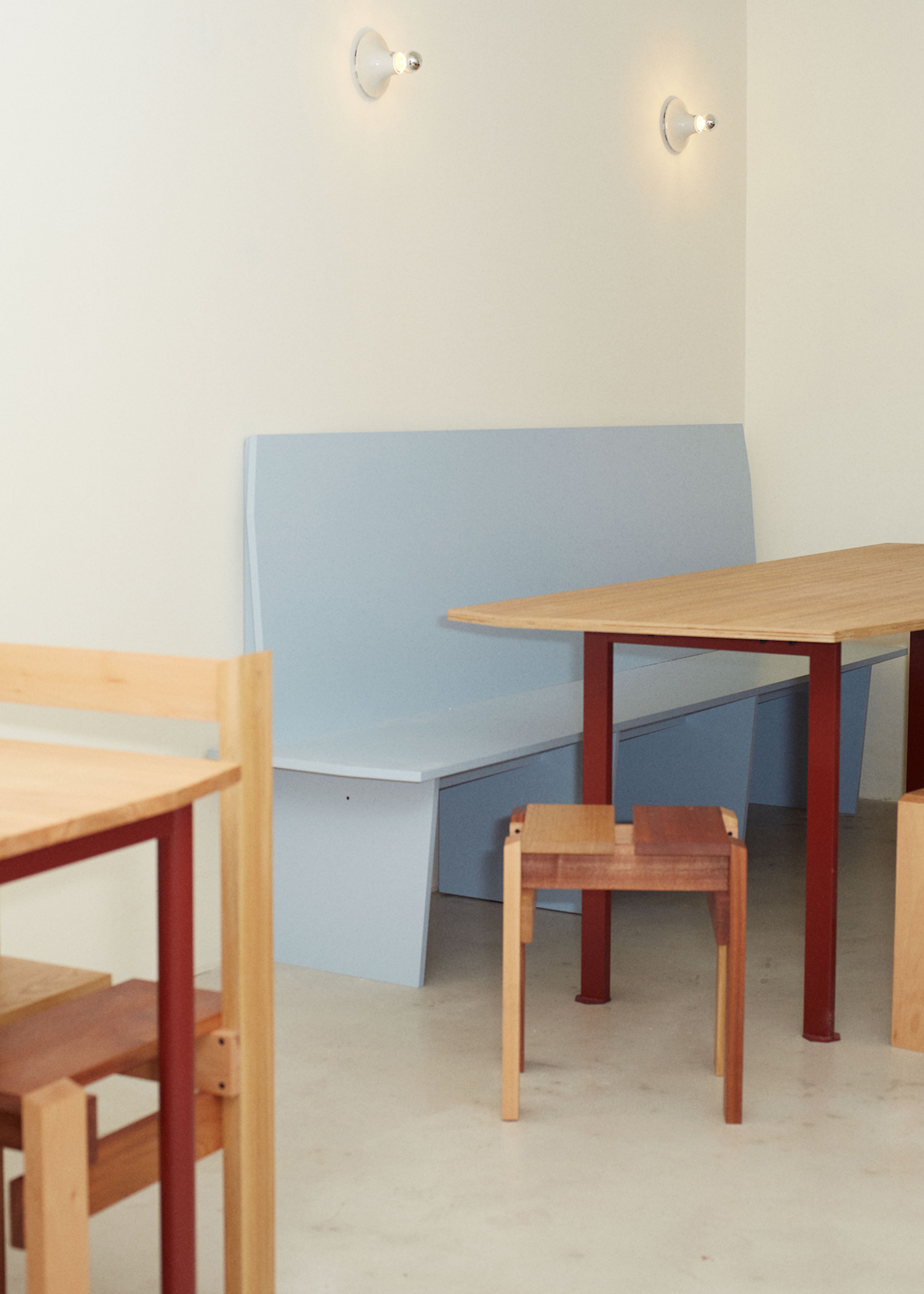 Furniture and interior for the basement extension of Redemption Roasters Lambs Conduit Street. Seating, tables and interior direction.