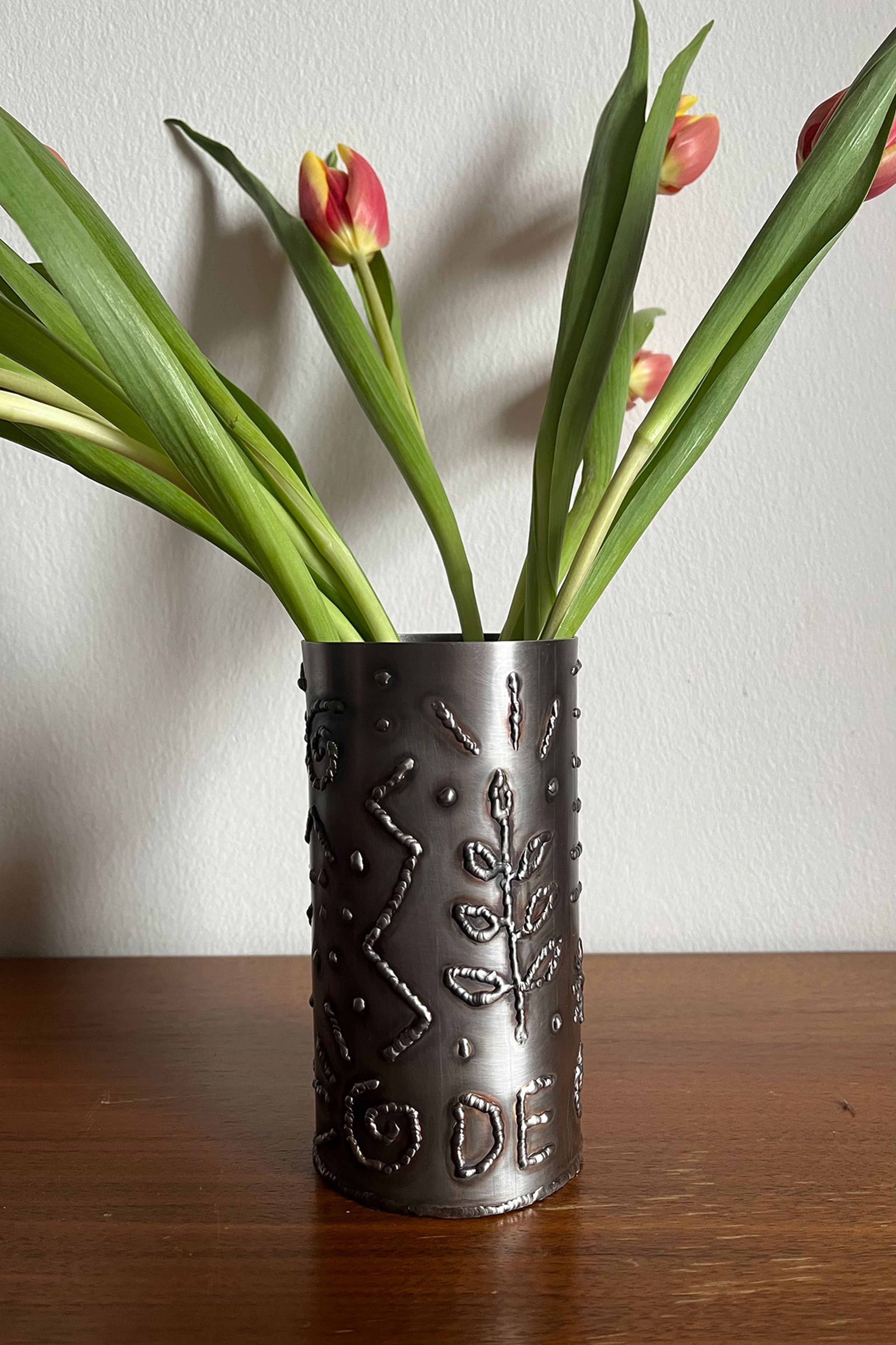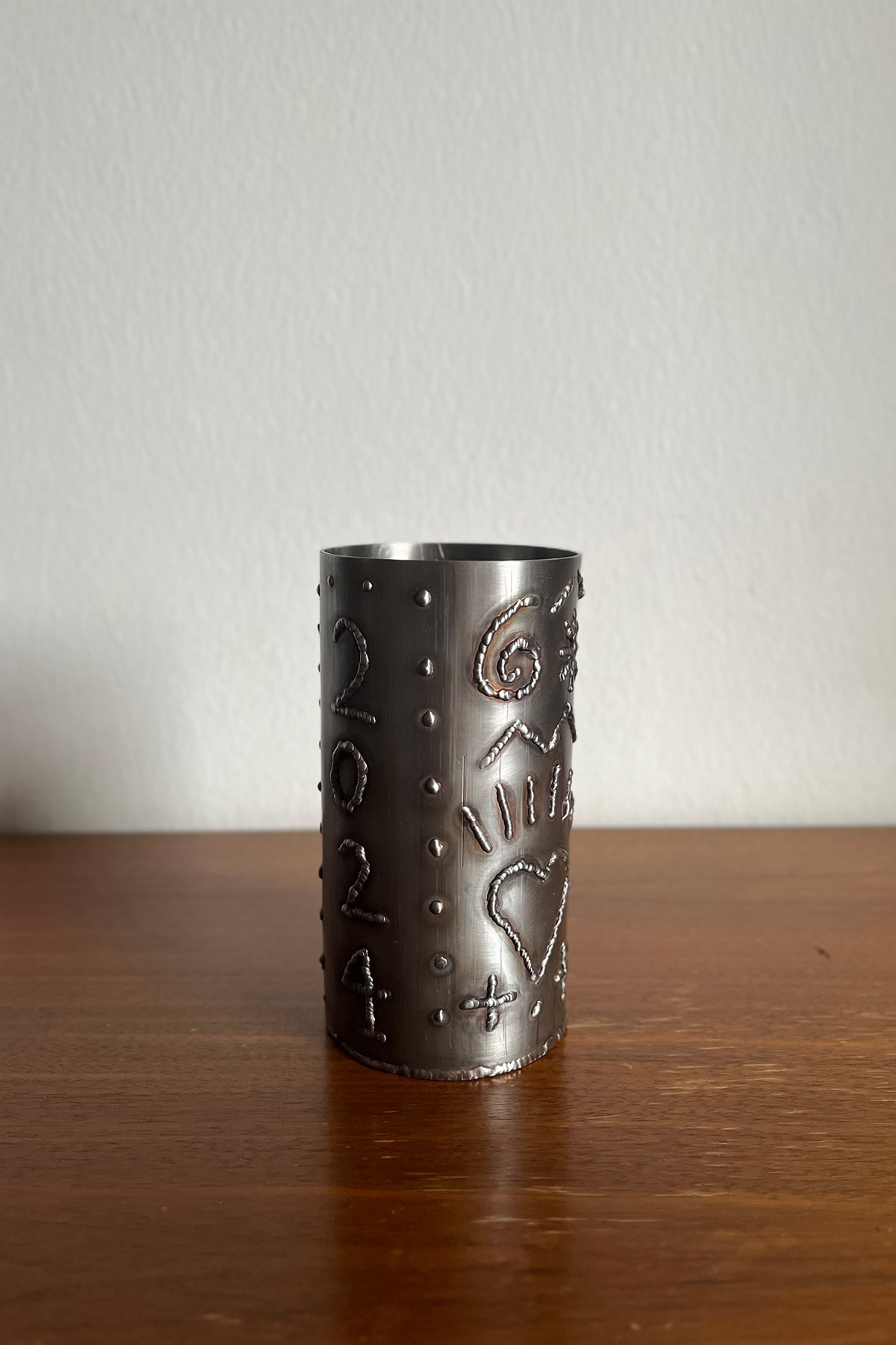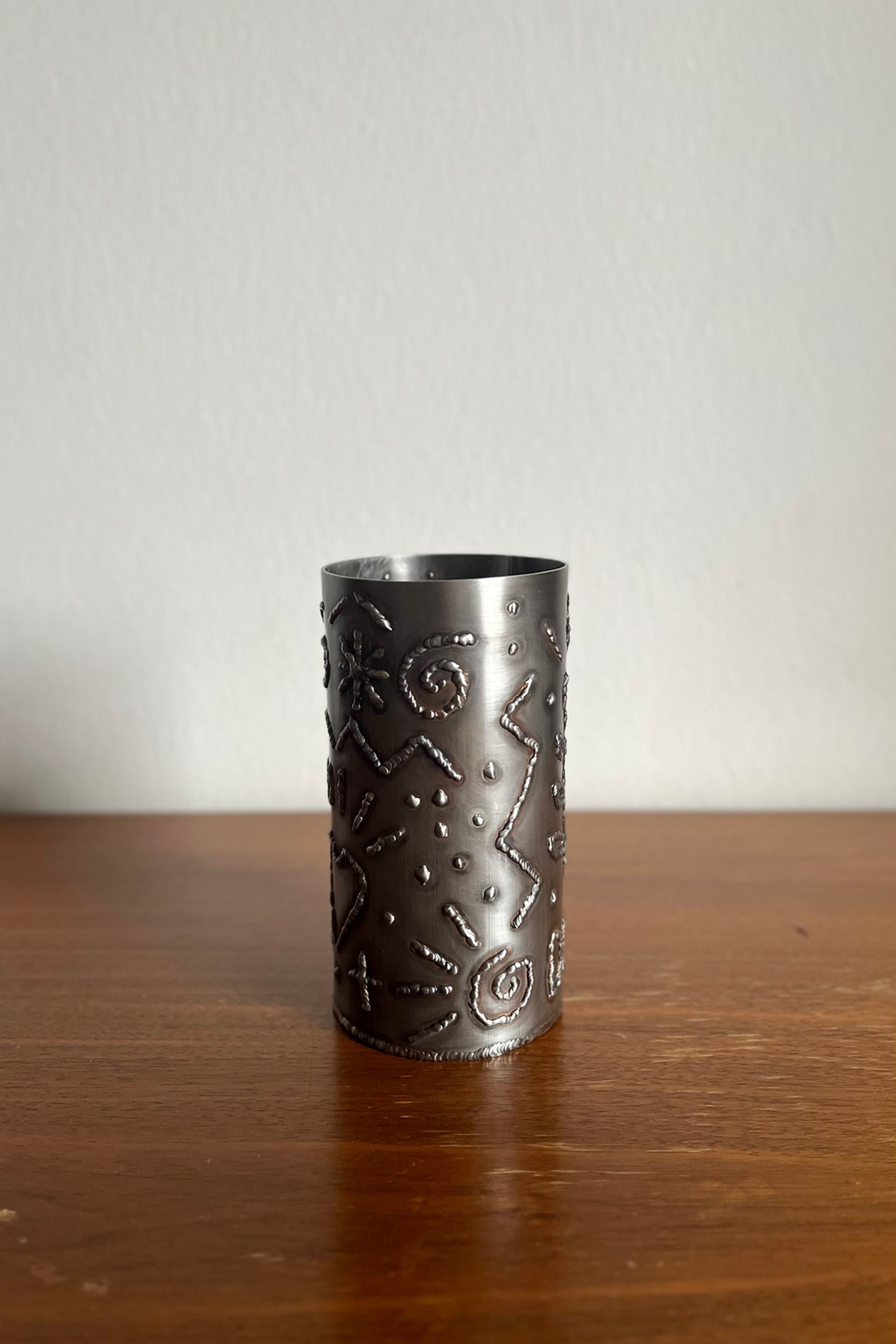 Stainless steel vessel with impromptu welded relief. An ode to a collection of 17th – 18th century British slipware that saw last year.
