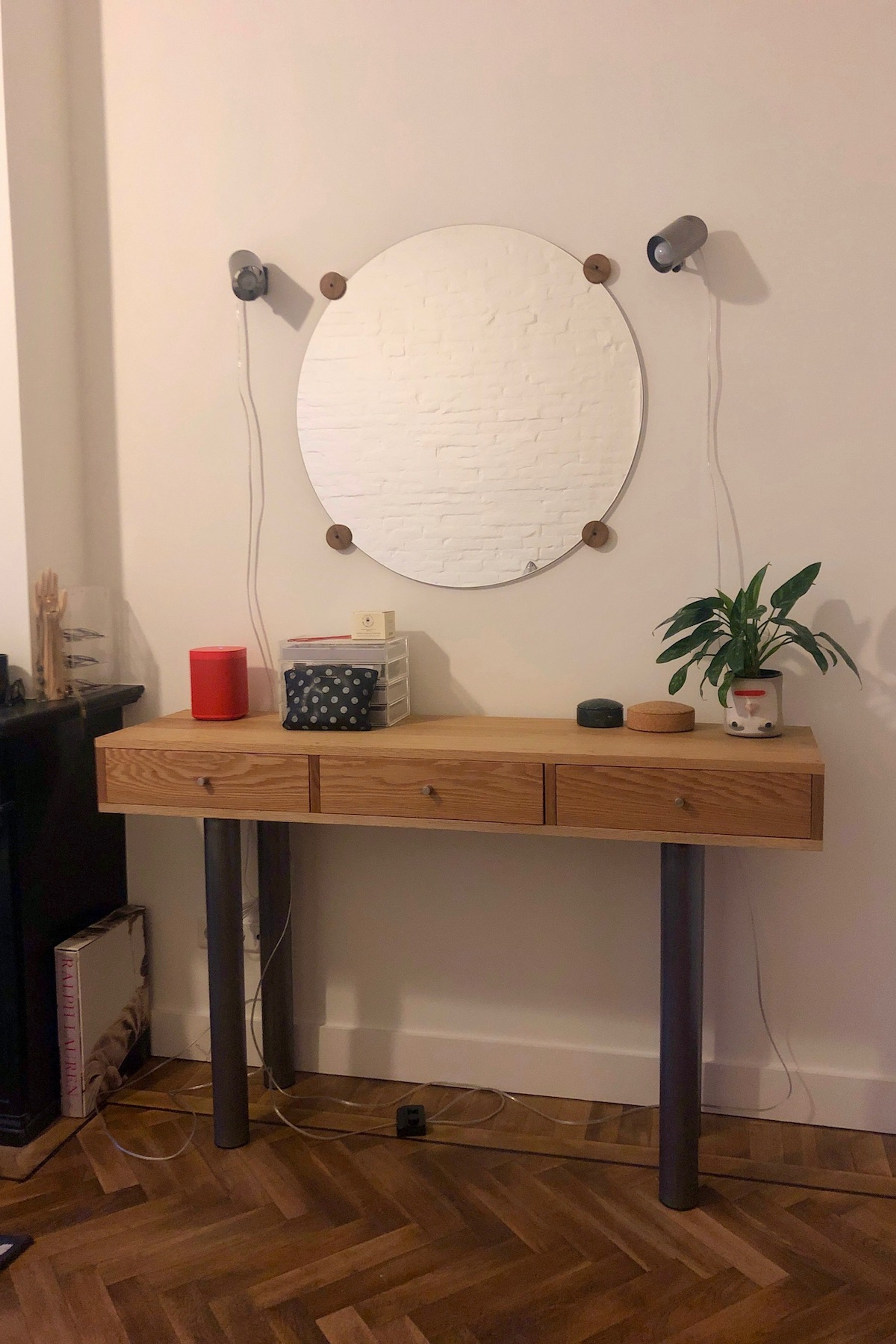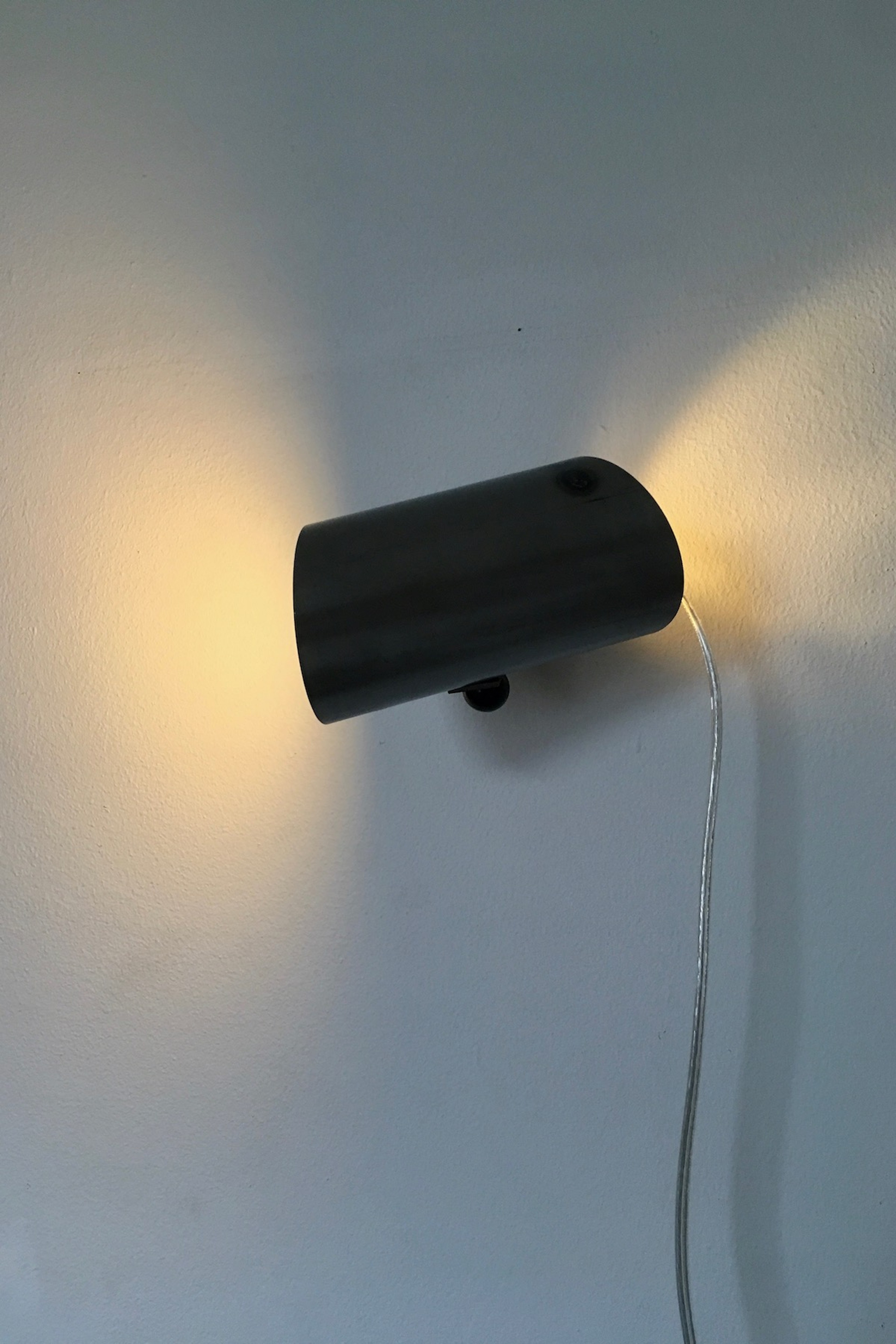 Pivoting wall lamps designed to fit with an earlier pice of furniture and mirror. The shade is mounted to the wall bracket via steel thread which can be adjusted and fixed with a bakelite ball knob.