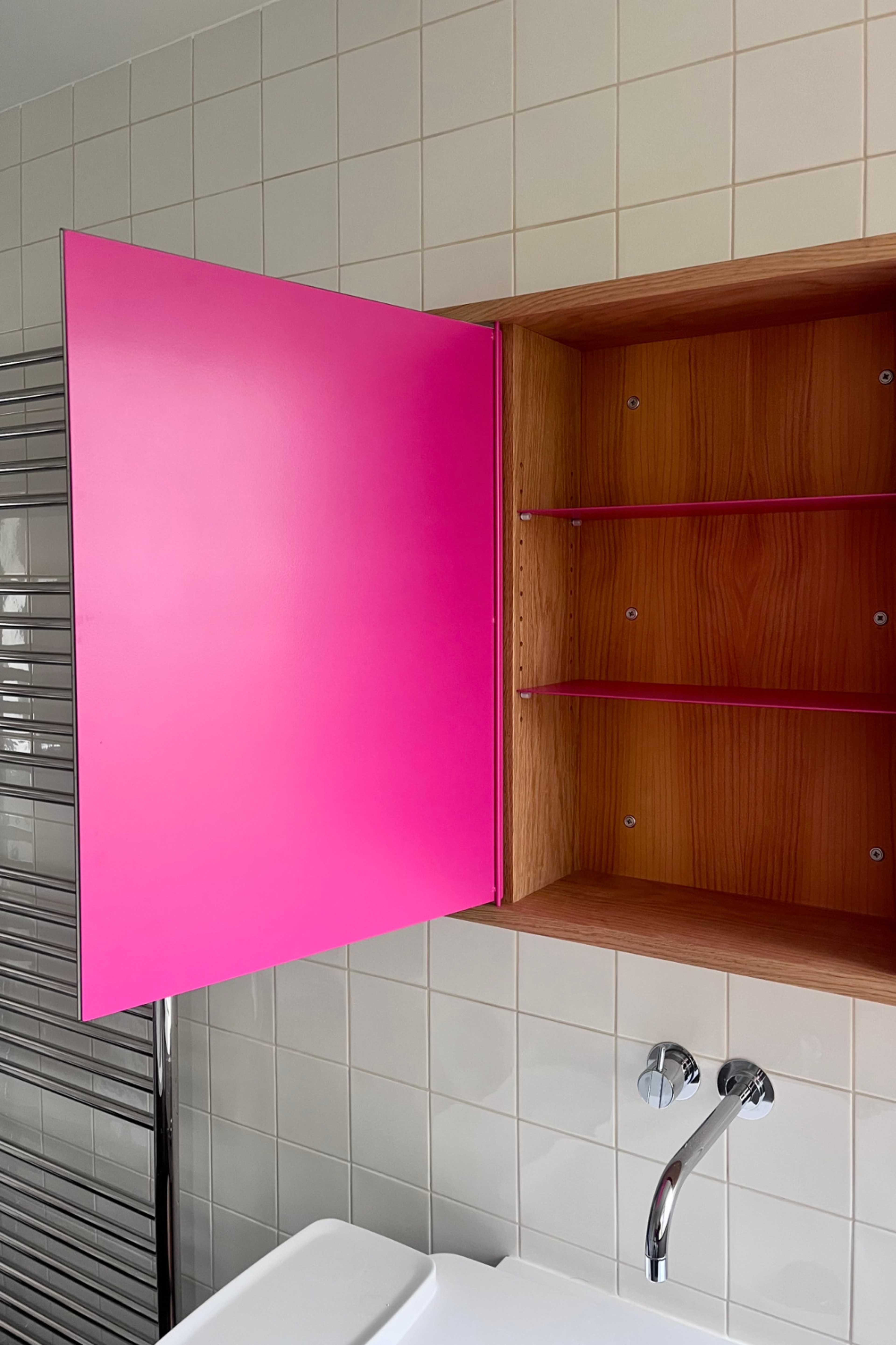 Bathroom cabinet with adjustable shelving and mirrored door.