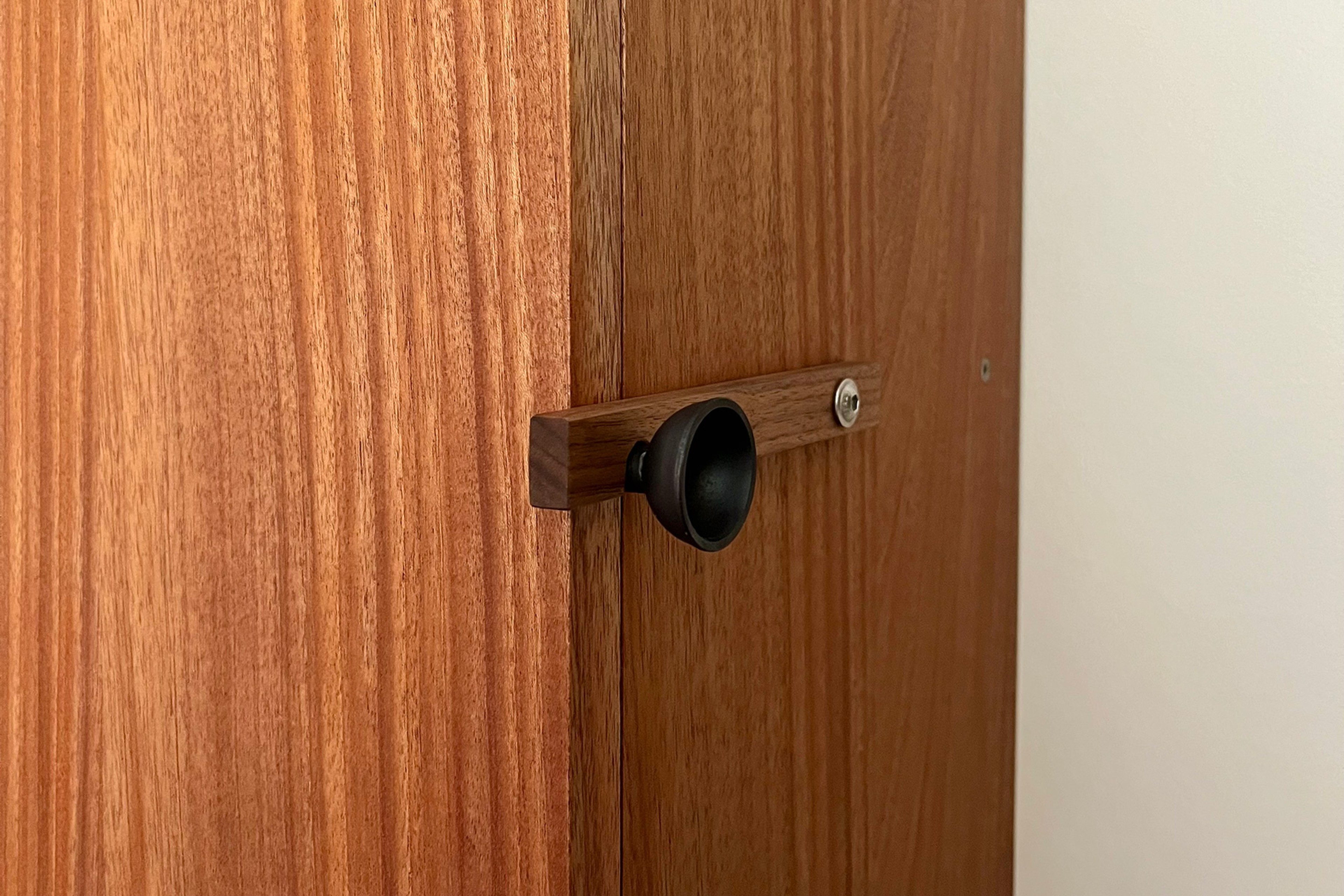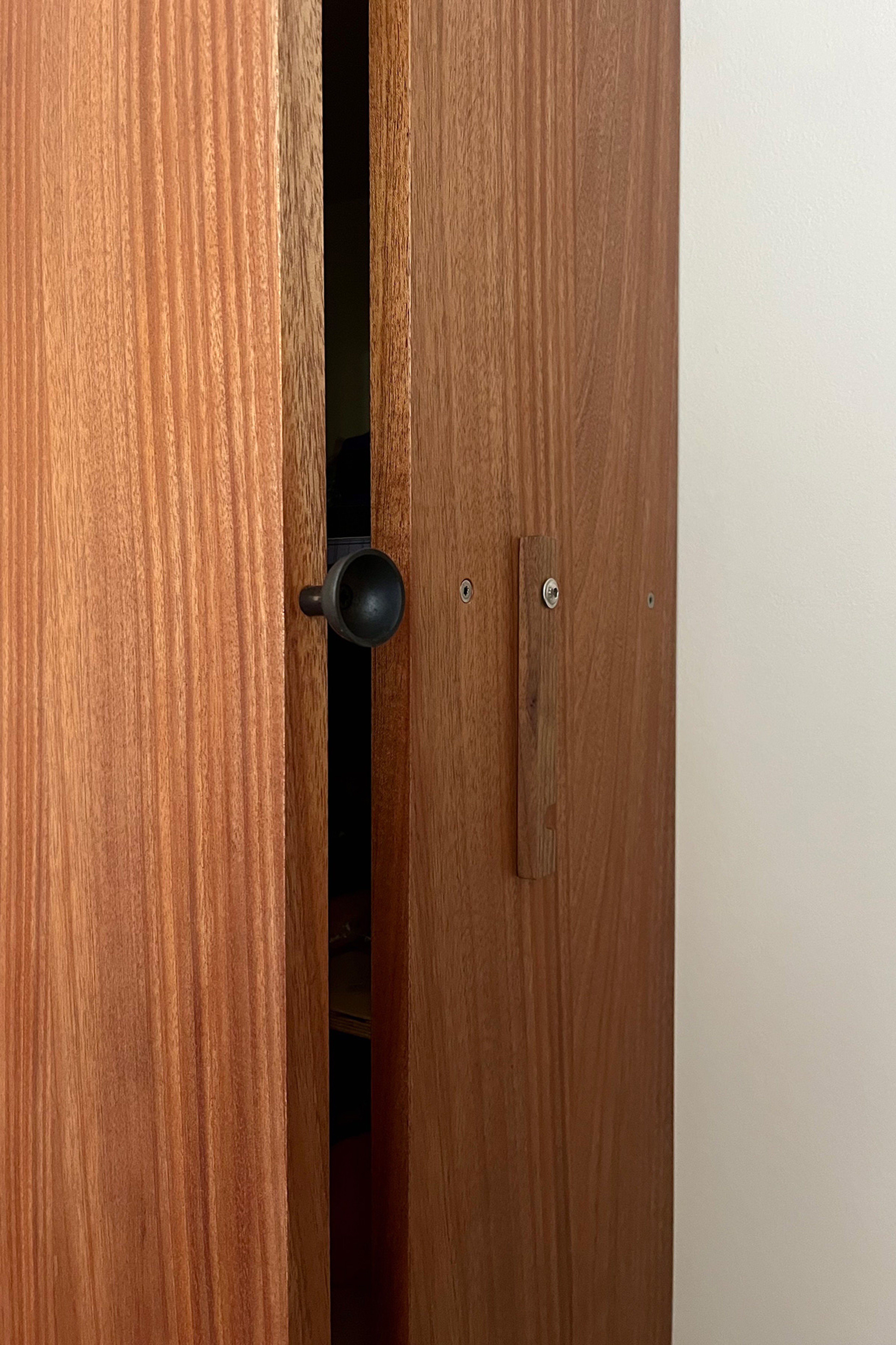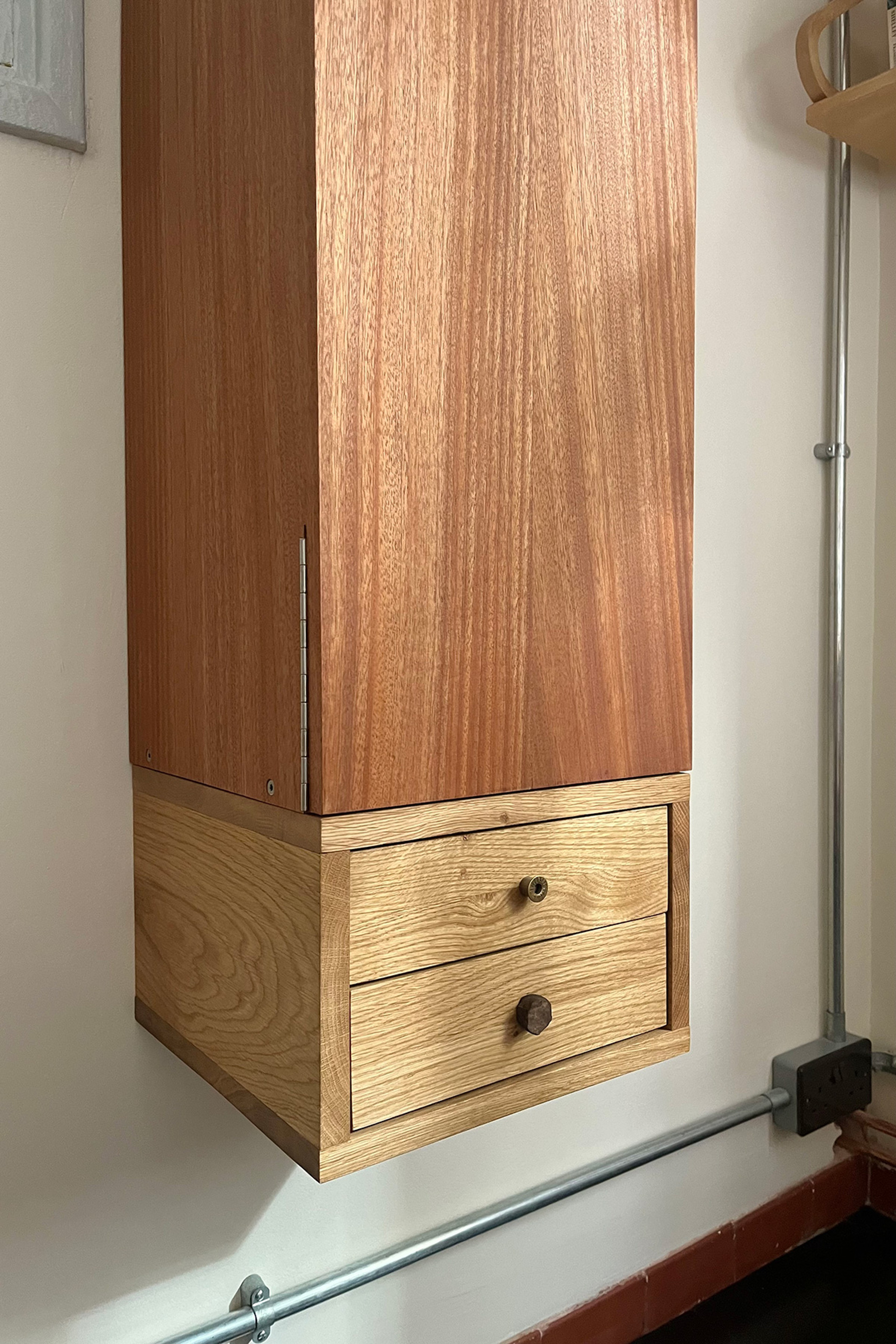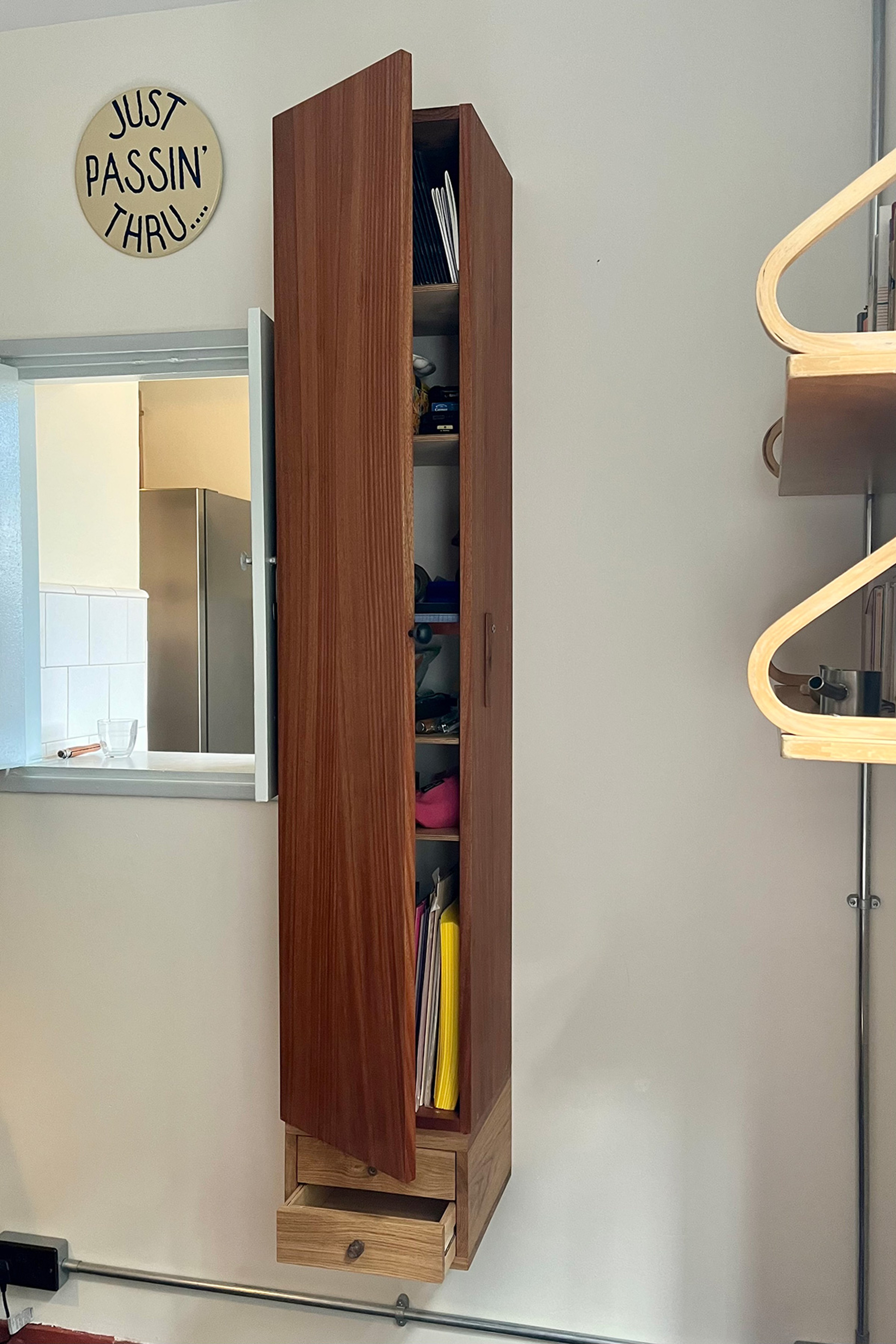 A tall narrow wall cupboard with drawers hung from its base, the one cannot exist without the other. Designed to house stationary at arms length in order to change dining table to desk without leaving your seat.