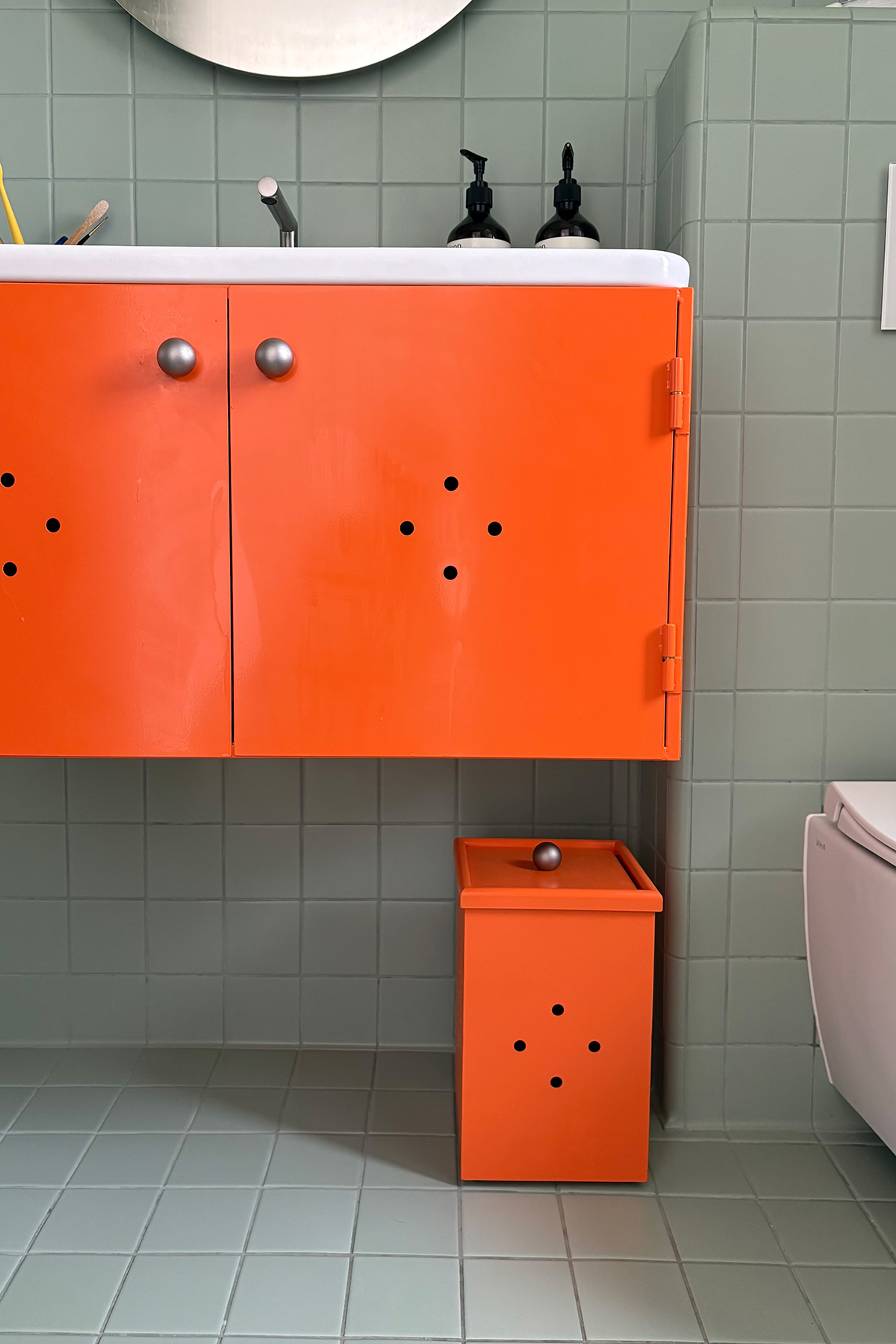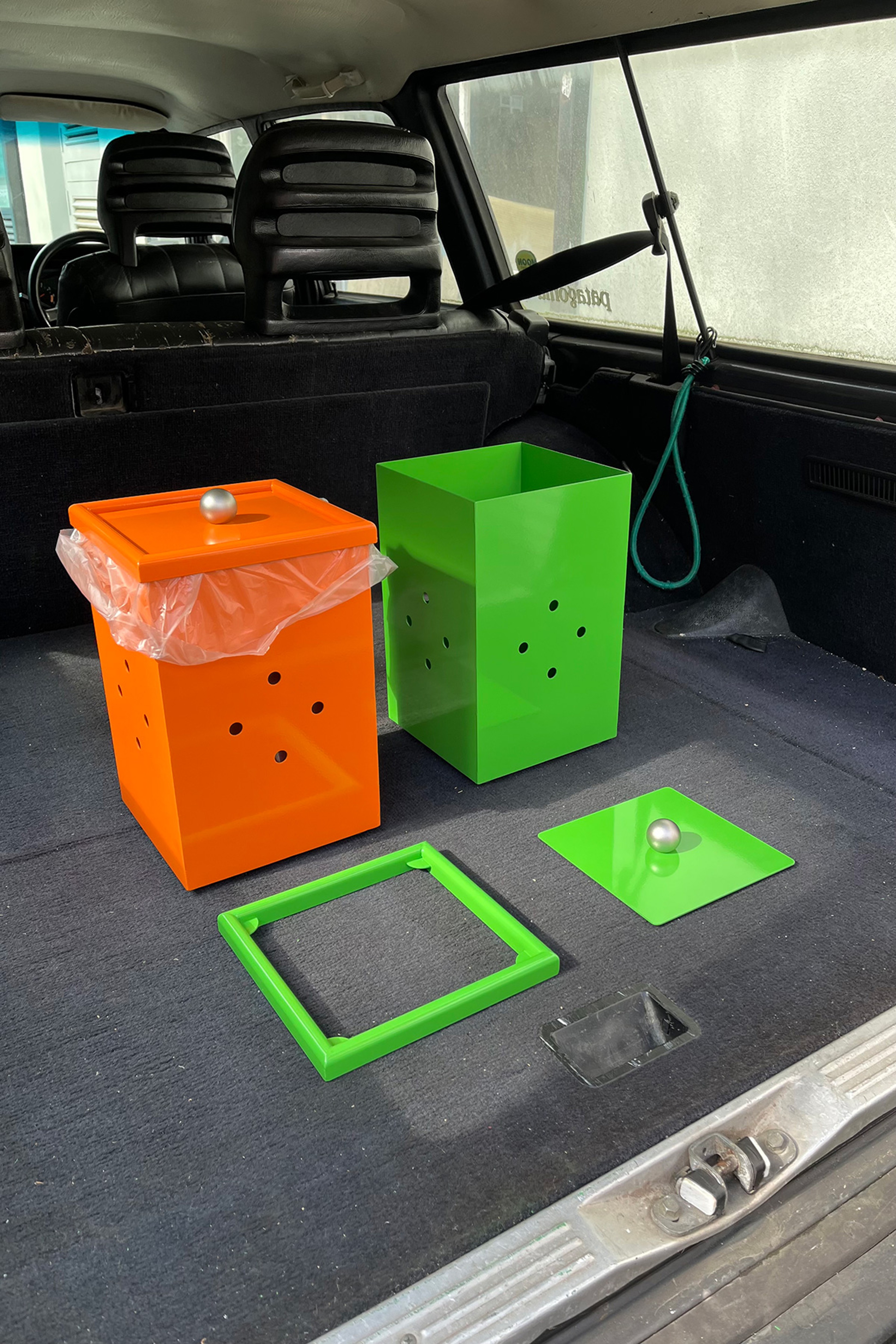 A pair of bathroom bins to match earlier cabinets. The lid locates into a bag securing collar.