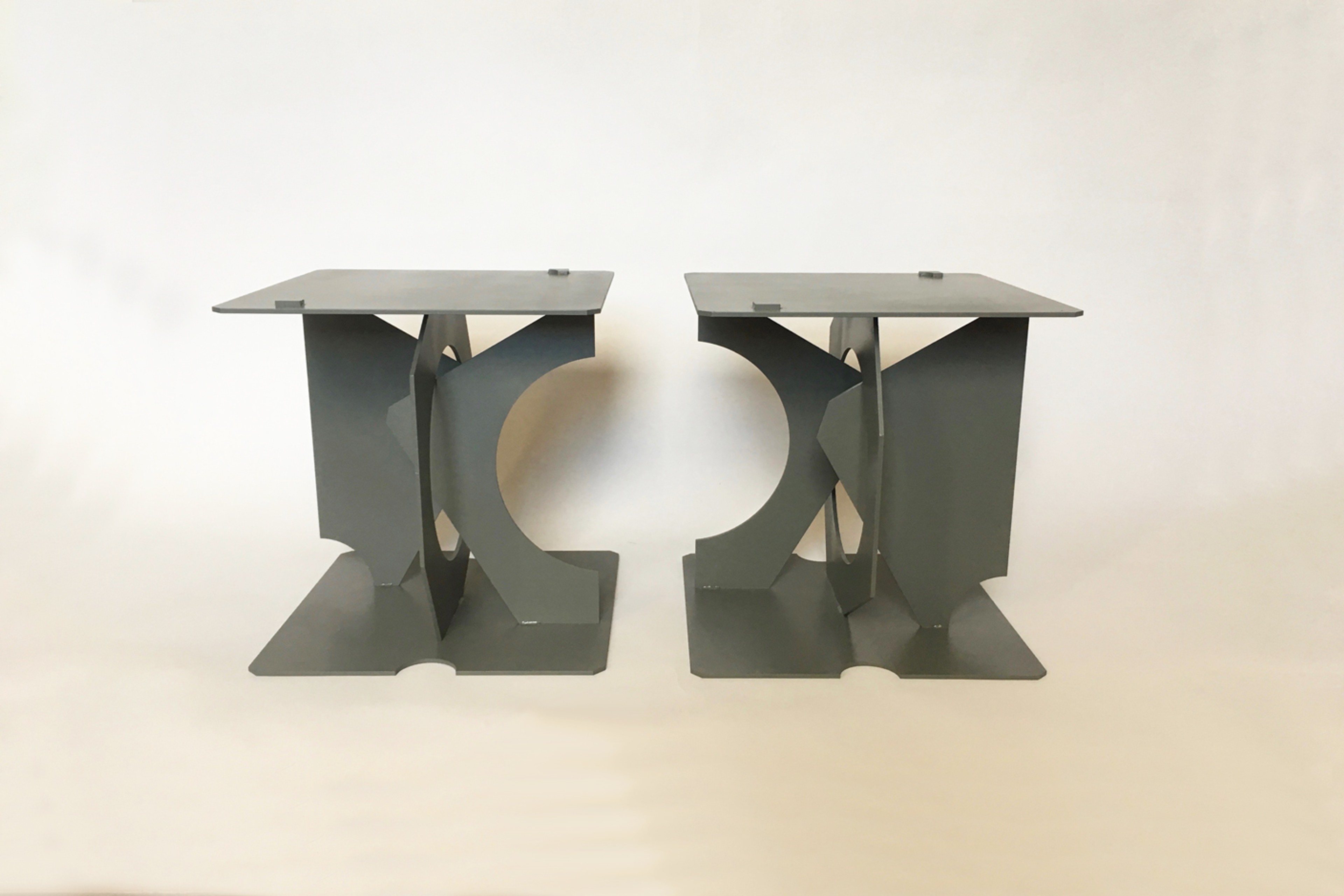 A pair of speaker stands specifically designed to work with Monitor Audio speakers. The forms consist of 300mm Square plates welded together, each of the vertical plates has had surface area removed through the drawing of lines and radius’ using a grid spaced at 50mm. The stands can also stack to achieve extra height.
