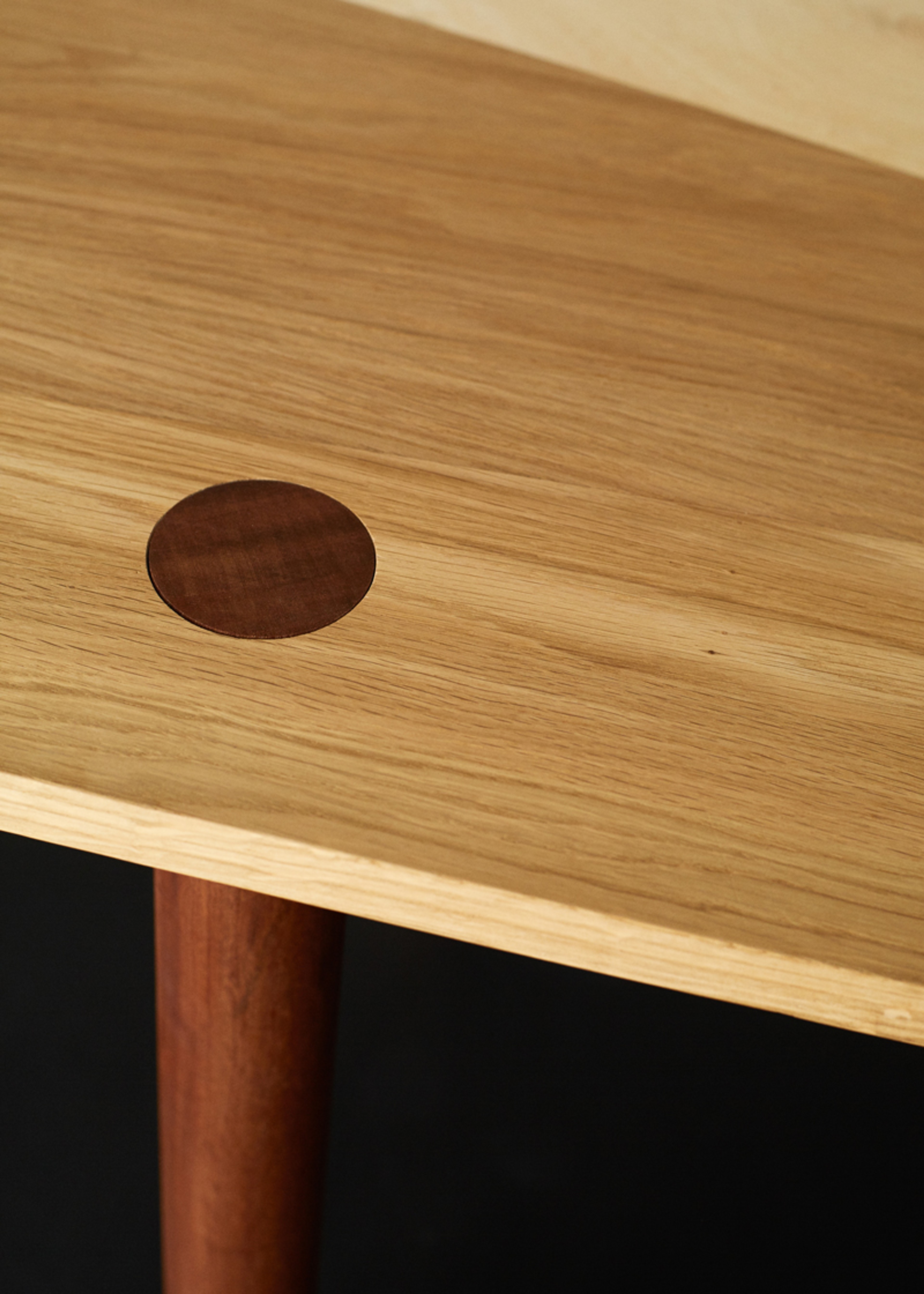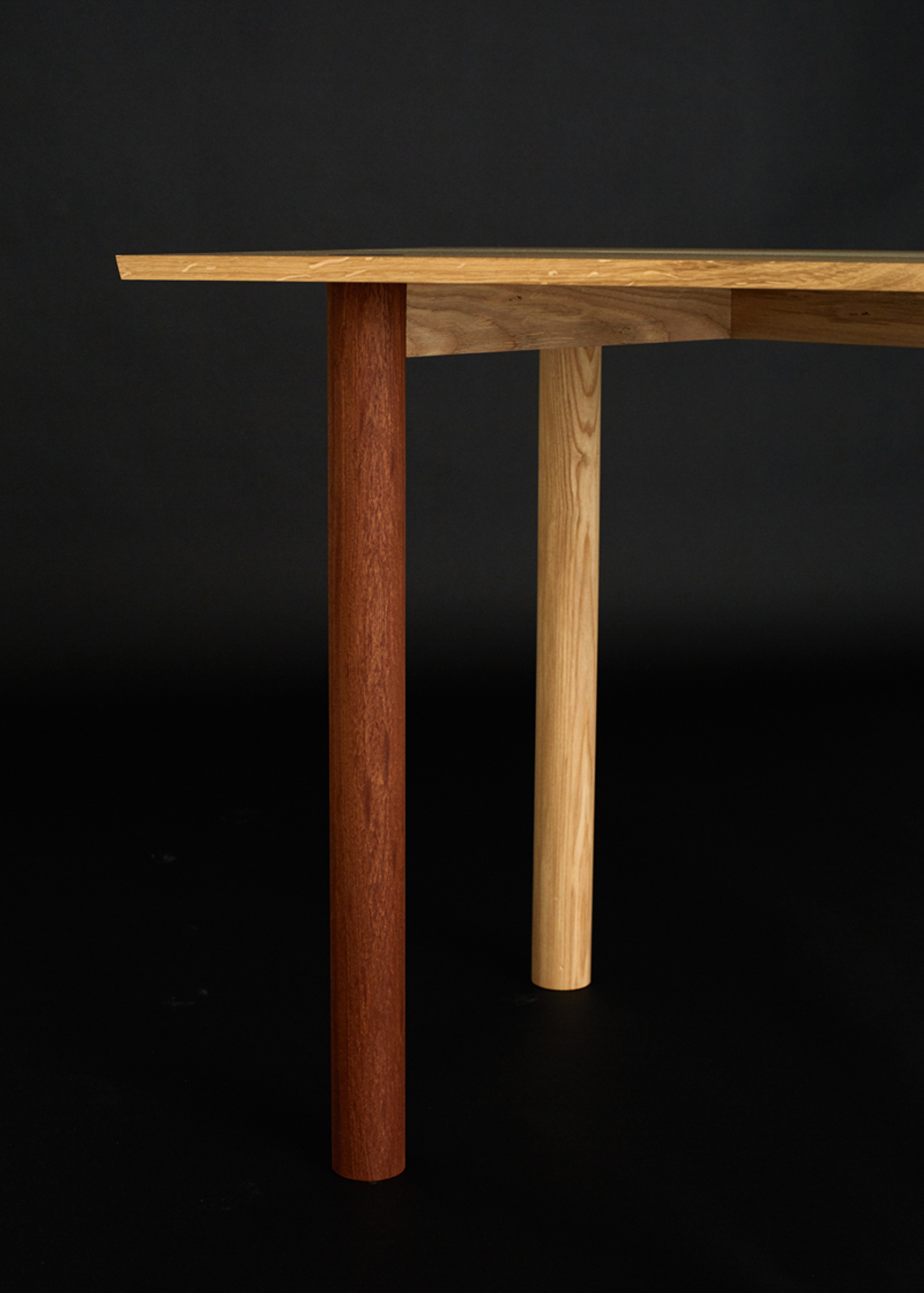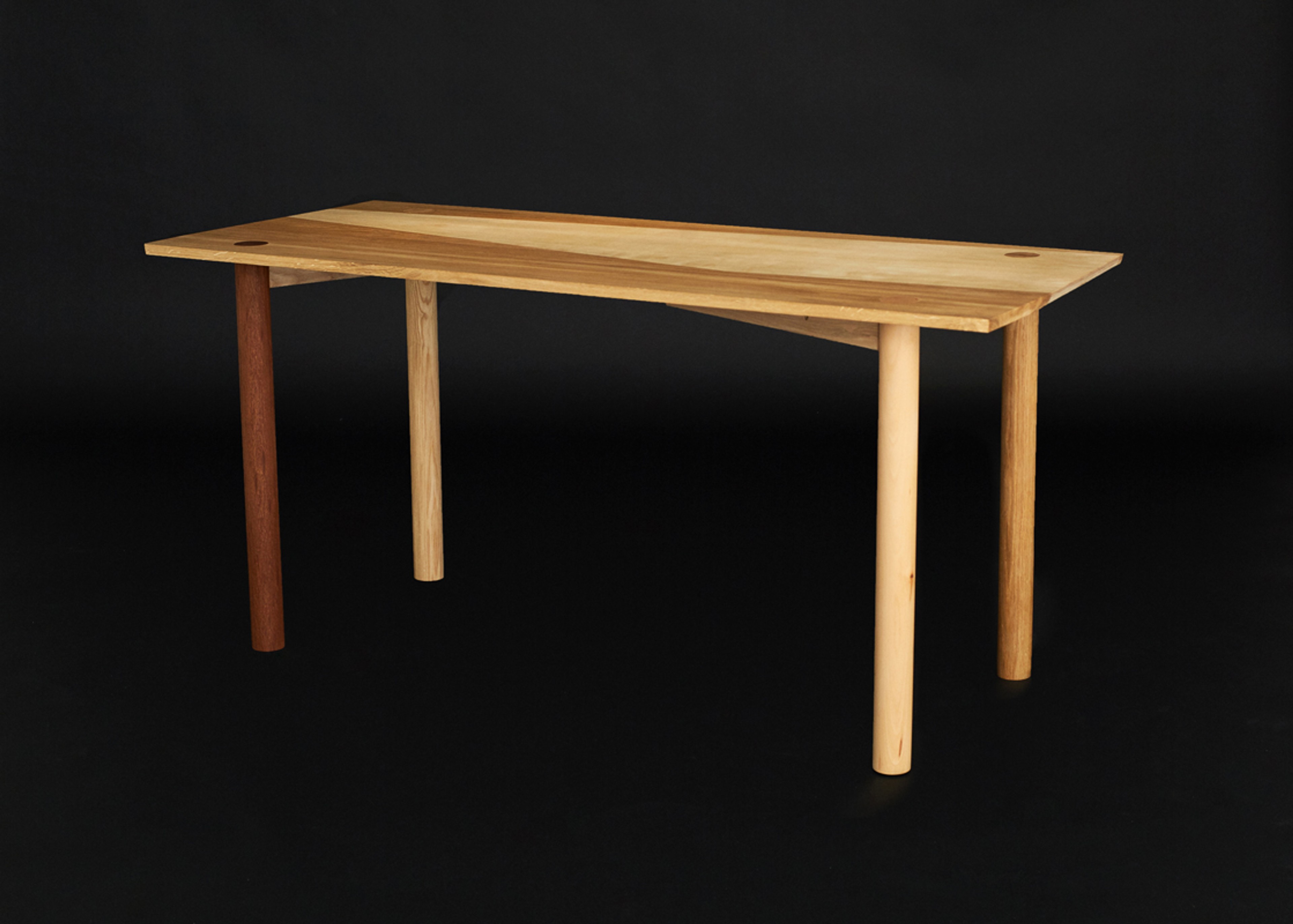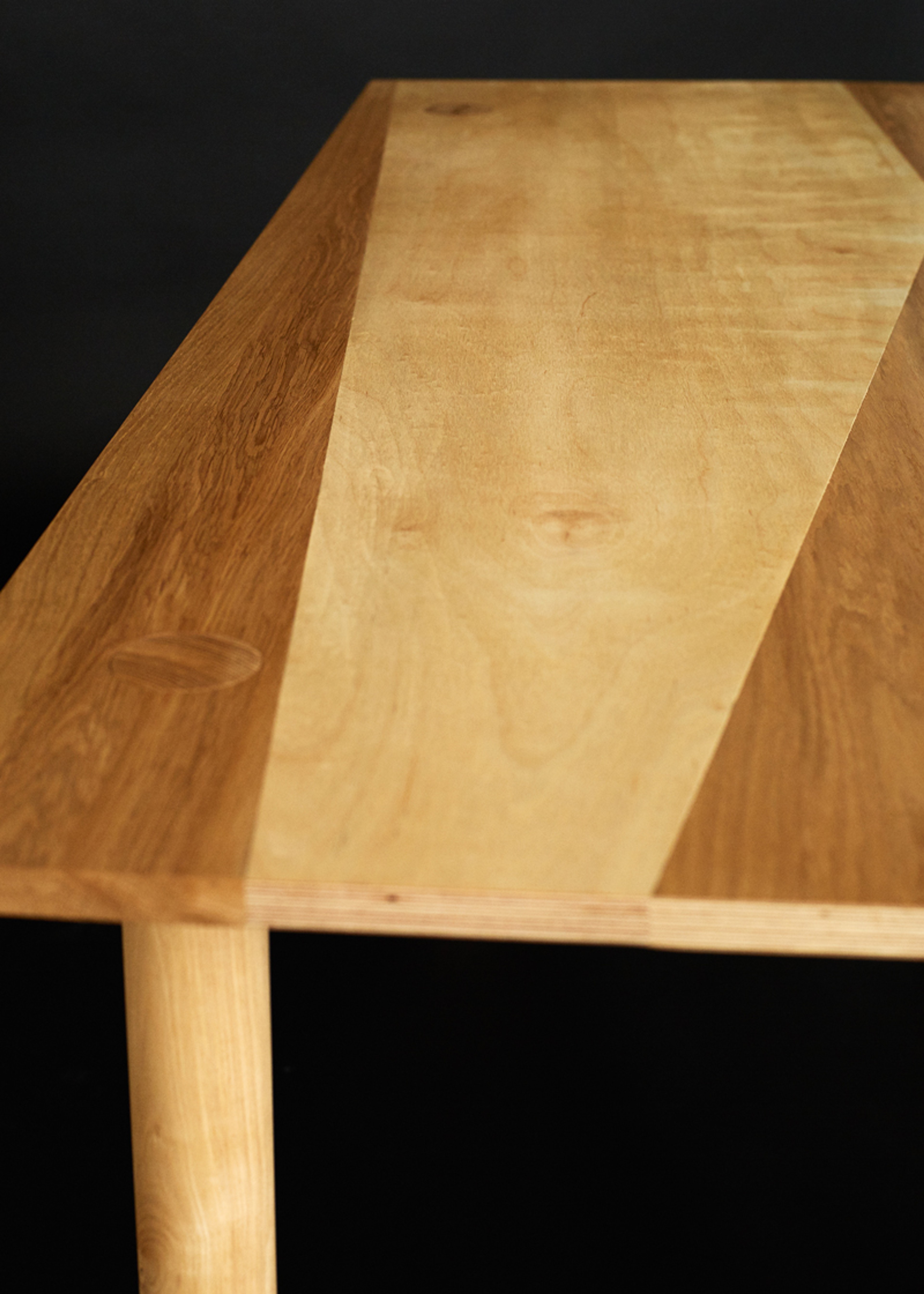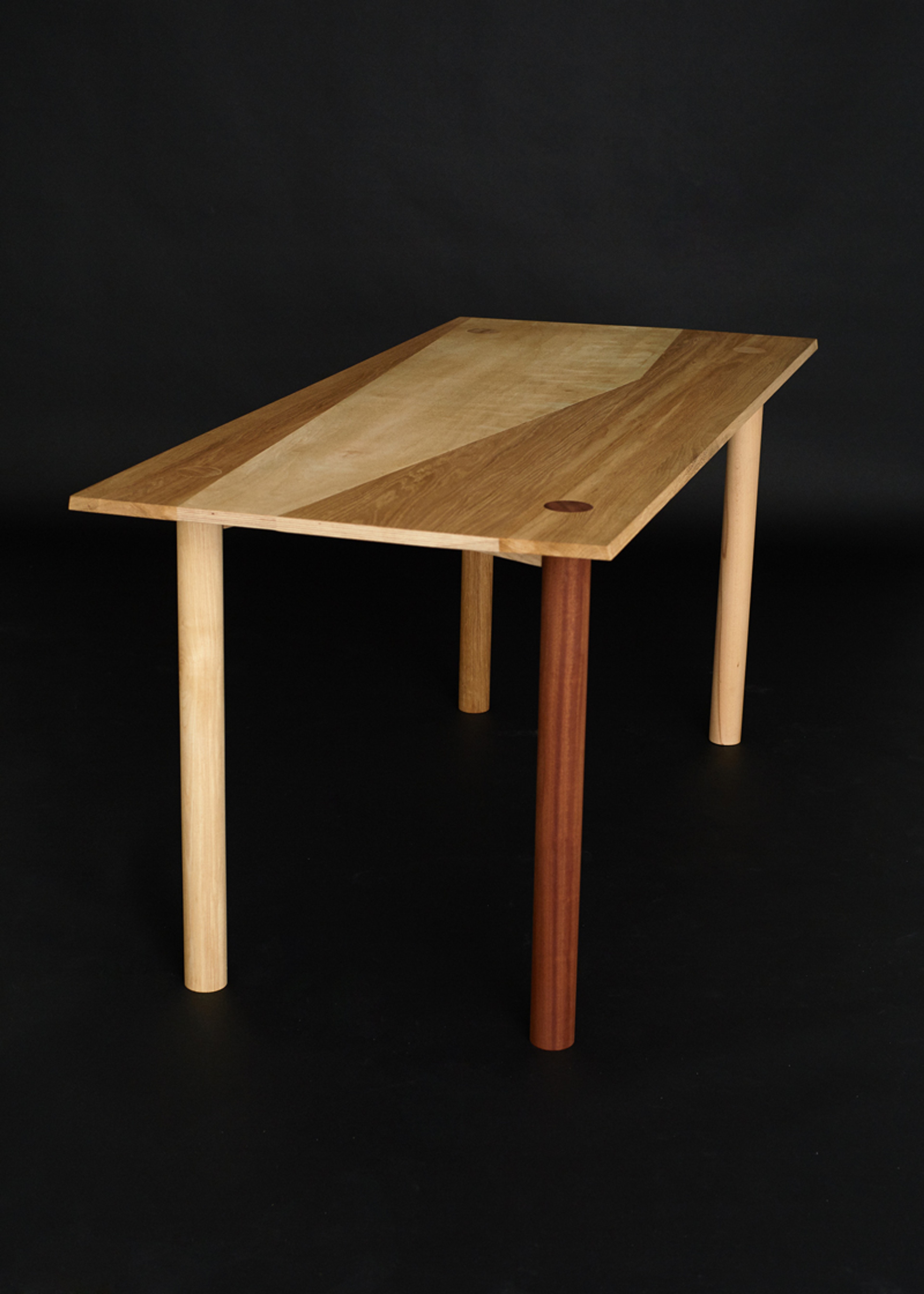 Dining table. From a request for something that was affordable yet a little “Wild” I decided a good starting point was to use some of the long narrow off cuts I had saved from various earlier projects. A narrow strip of Oak board is cut diagonally at 5 degrees, these two parts are then joined onto two contrasting Ply strips increasing the width whilst keeping the solid edge. Continuing the irregular pattern of the top 4 dowel legs of Sapele, Oak, Beech and Ash are then fitted to this with the end grain exposed through the top, these are held in place through friction and the addition of an Ash sub frame which in turn supports the top.